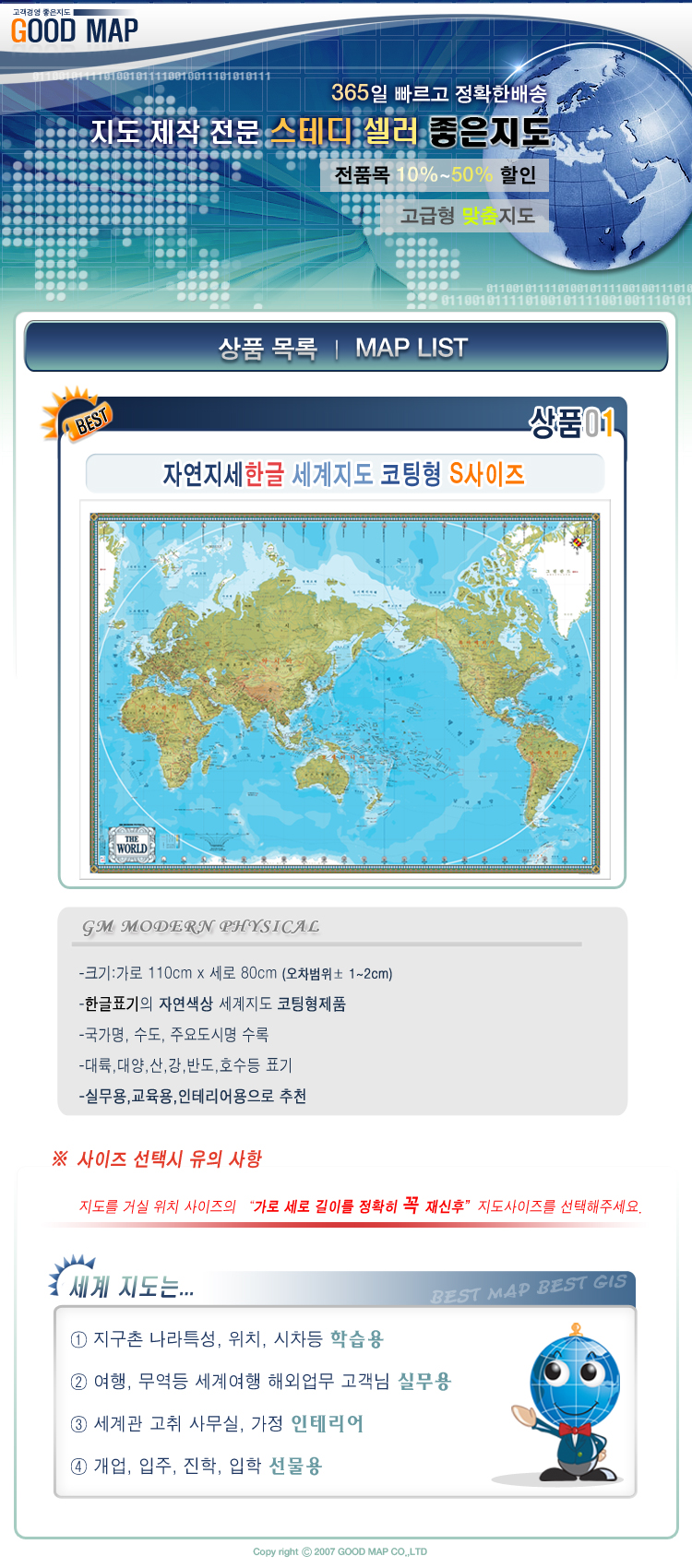 품명 및 모델명 [좋은지도]세계지도 GM 자연지세 한글 코팅 S사이즈