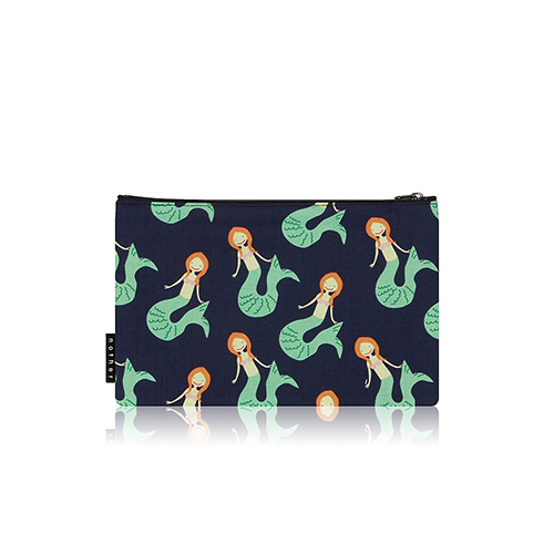 짙은 네이비 배경 위에 오렌지, 민트 등 포인트 컬러들로 표현된 인어의 모습을 패턴화한 코튼 소재 파우치 입니다.