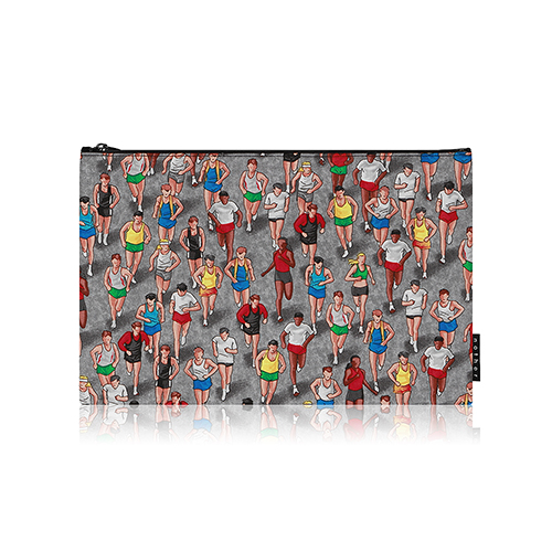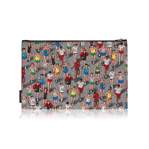 This pouch features a crowd of male and female runners on a gray asphalt background.