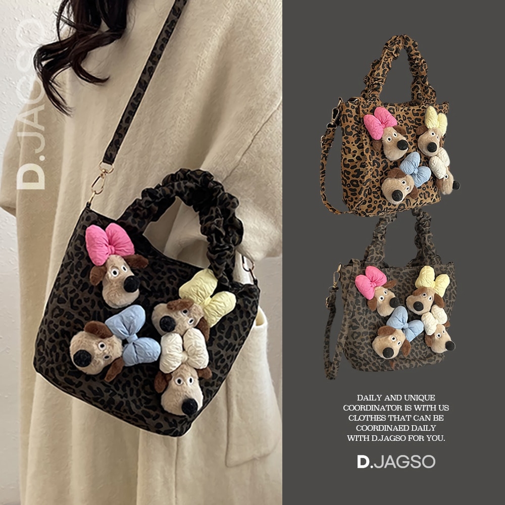 여성 리본 강아지 캐릭터 호피 토트 숄더백