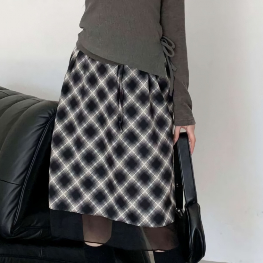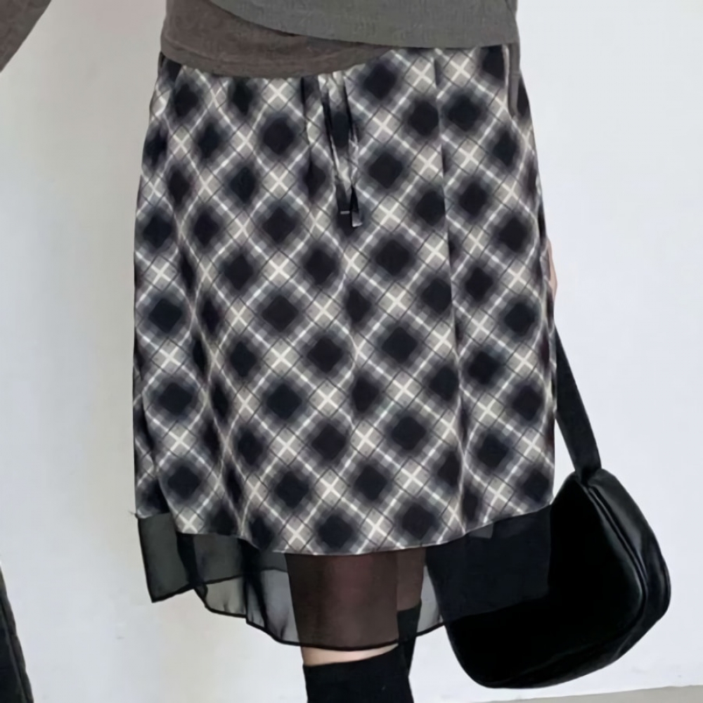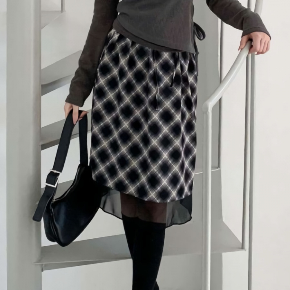 여성 겨울 레이어드 체크 밴딩 미디스커트