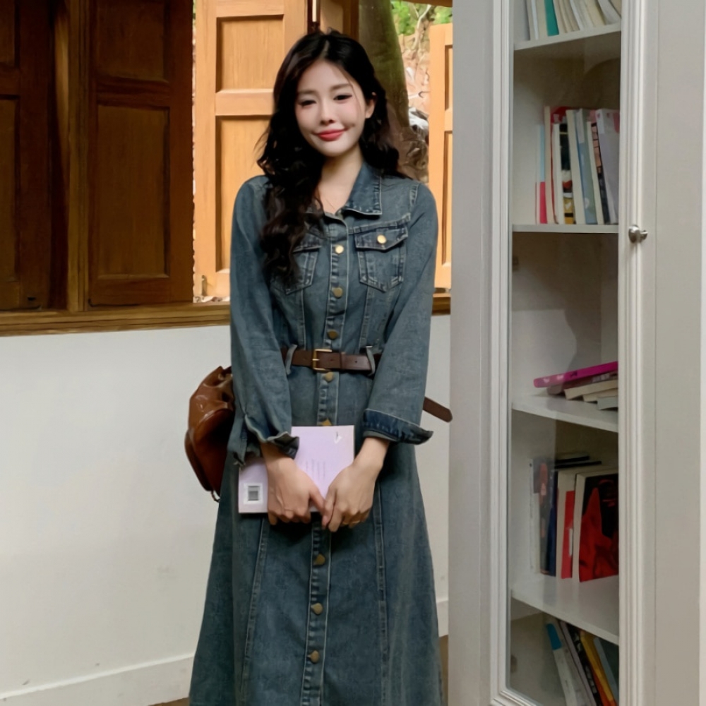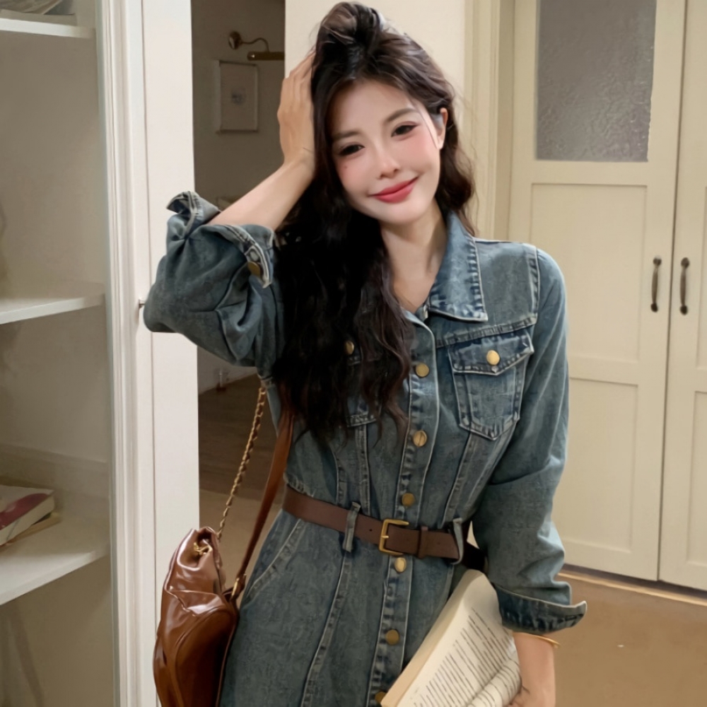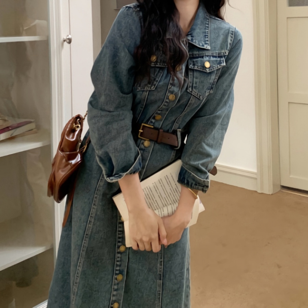 여성 가을 겨울 벨트 세트 데님 롱원피스