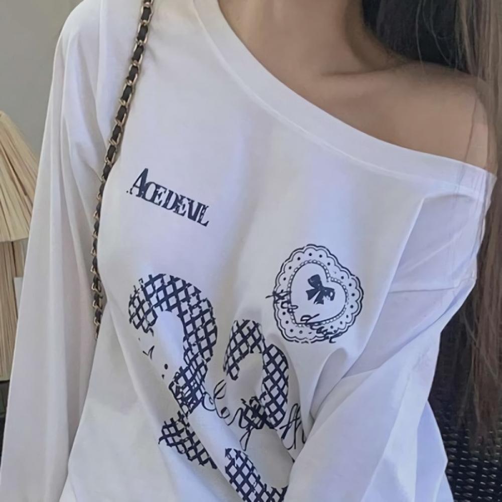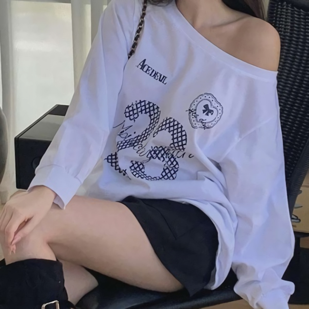 프린팅 보트넥 원 오프숄더 오버핏 맨투맨