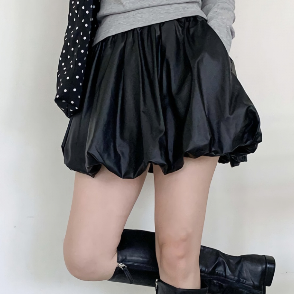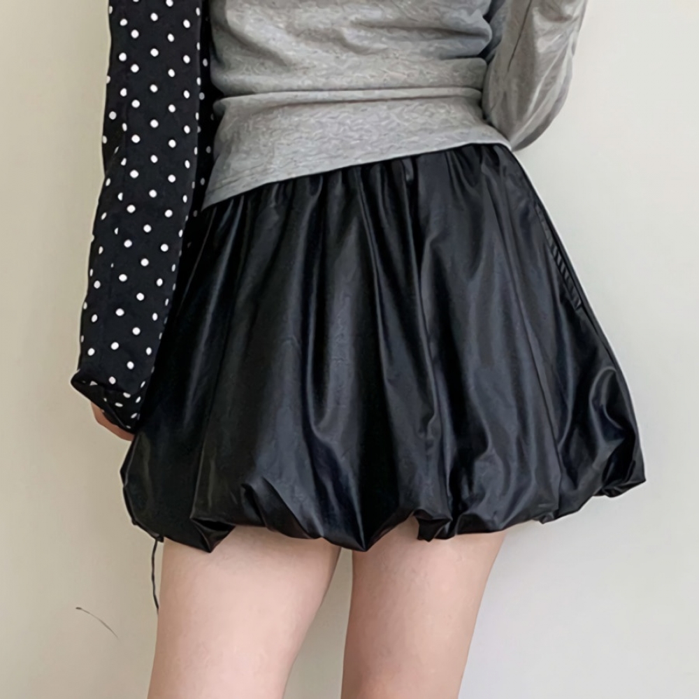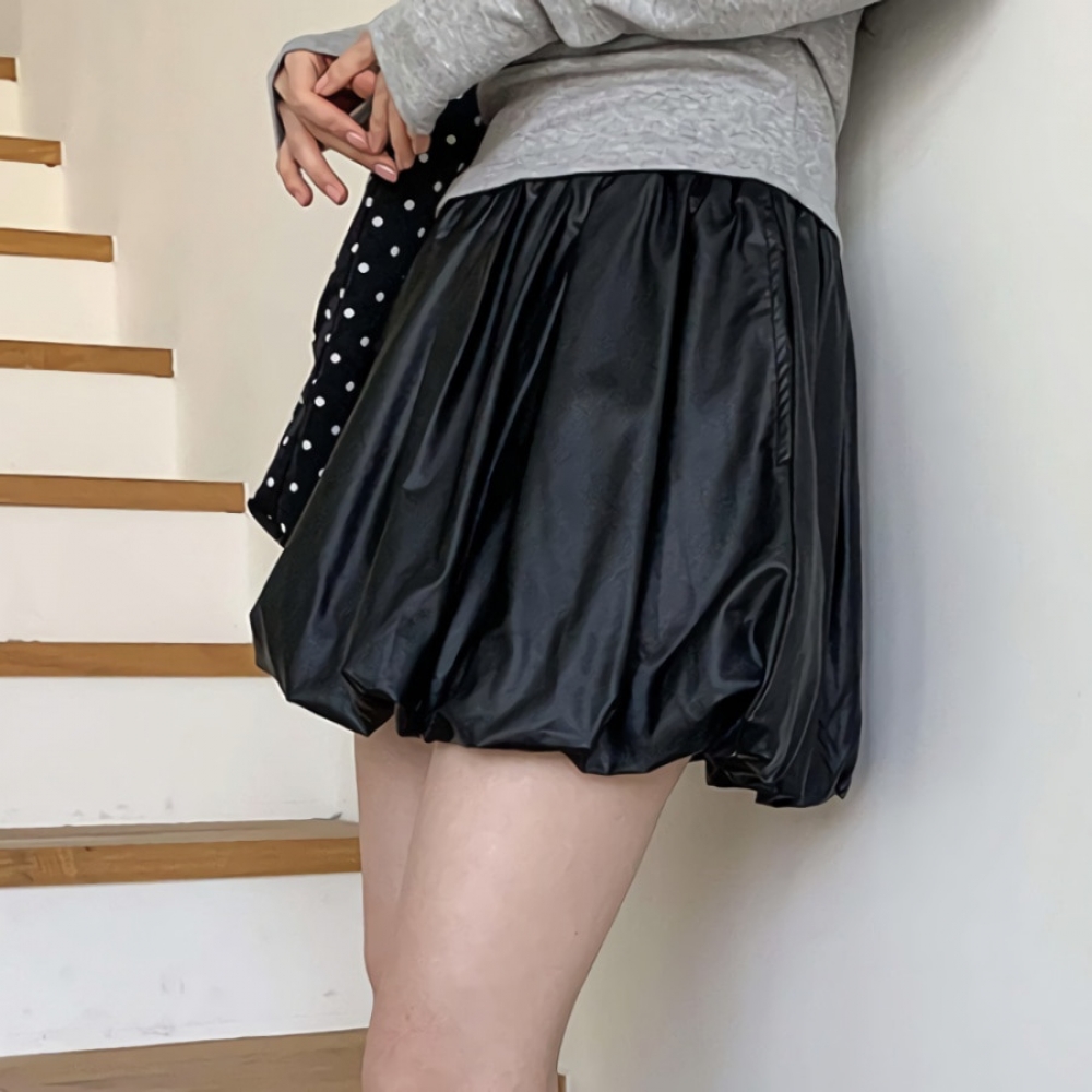 여성 포켓 레더 밴딩 벌룬 미니 스커트