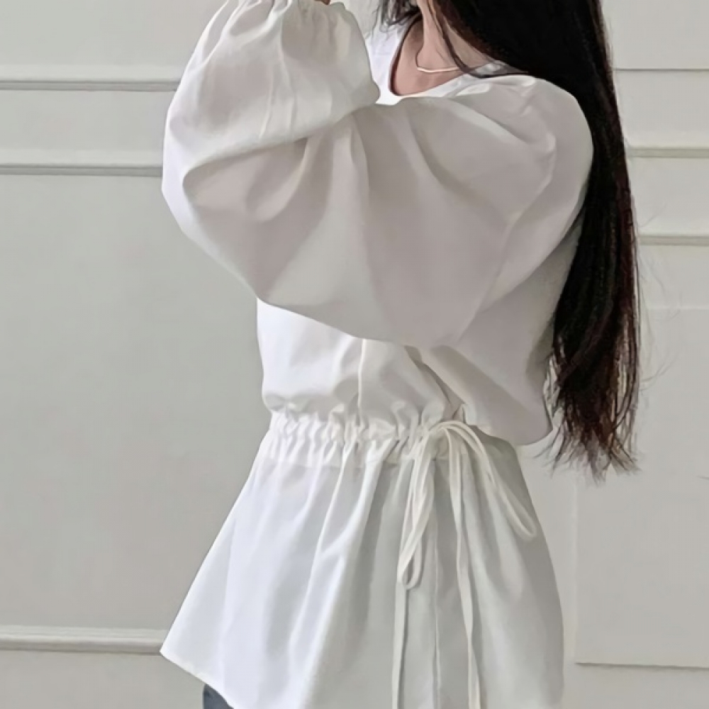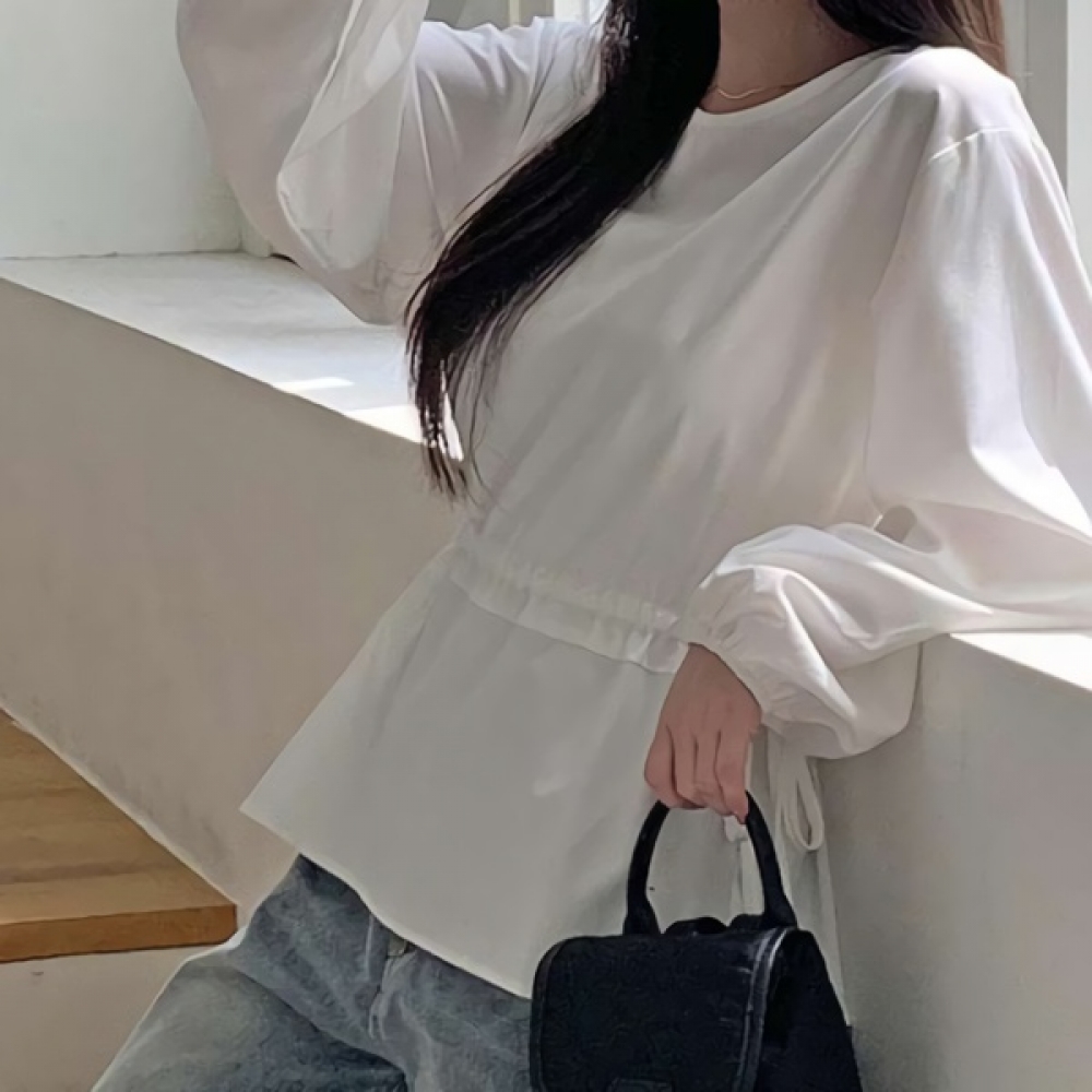 오버핏 리본 스트랩 긴팔 라운드 블라우스