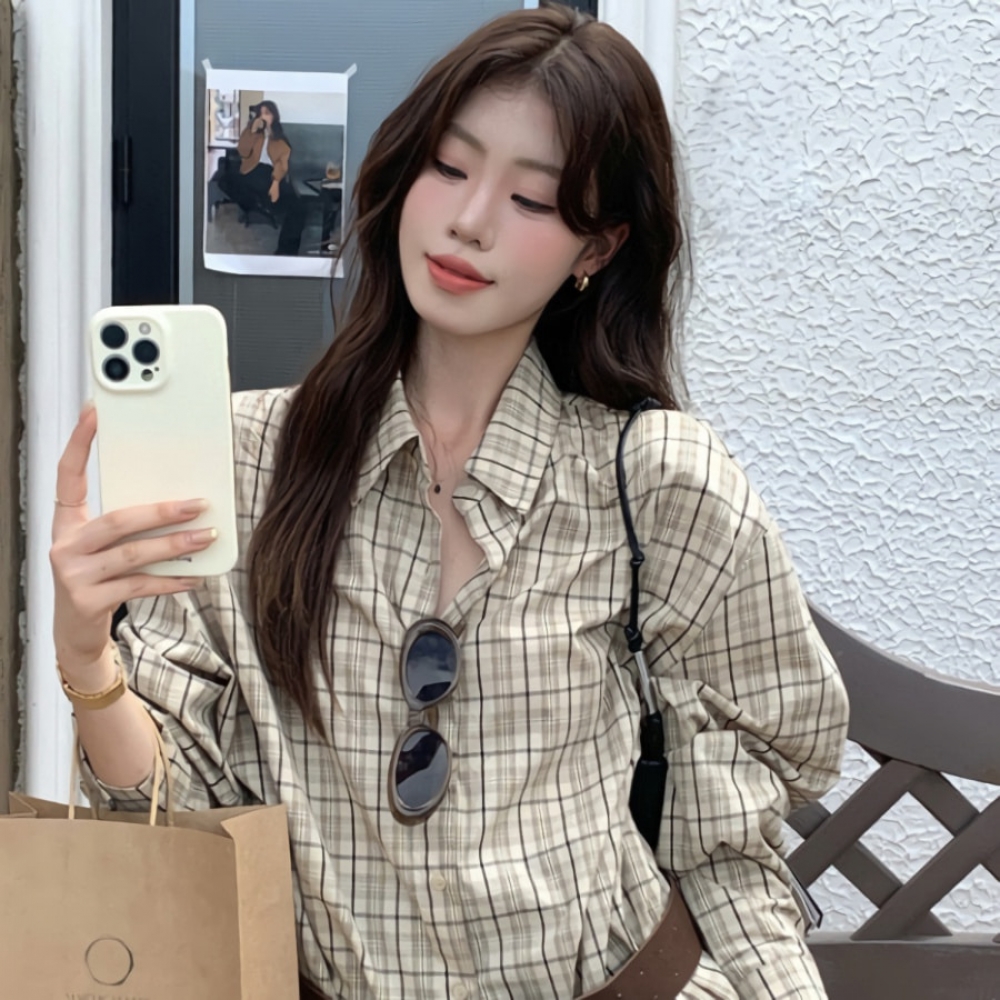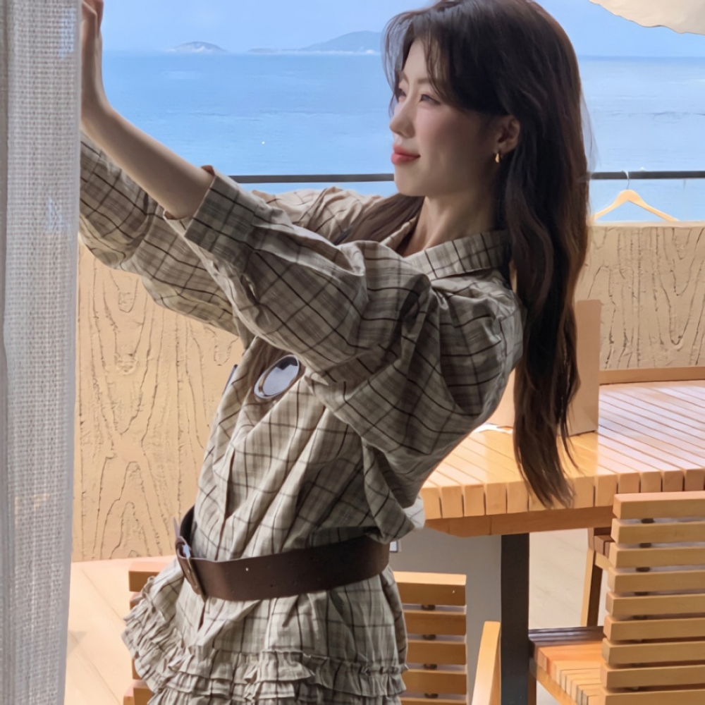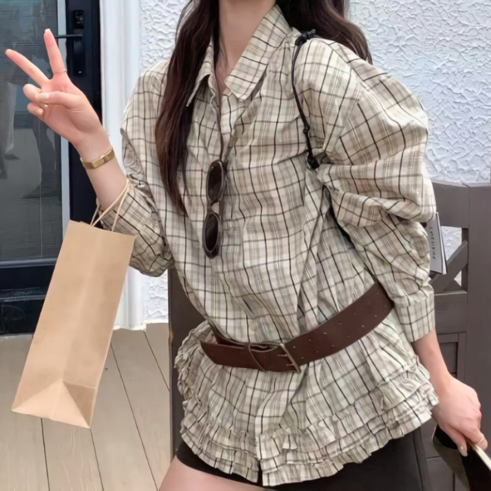 여성 가을 겨울 밑단 프릴 체크셔츠 벨트