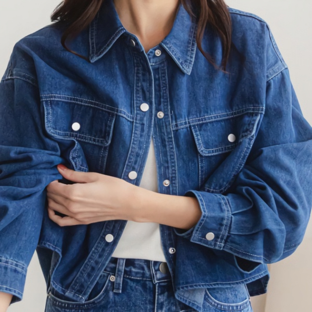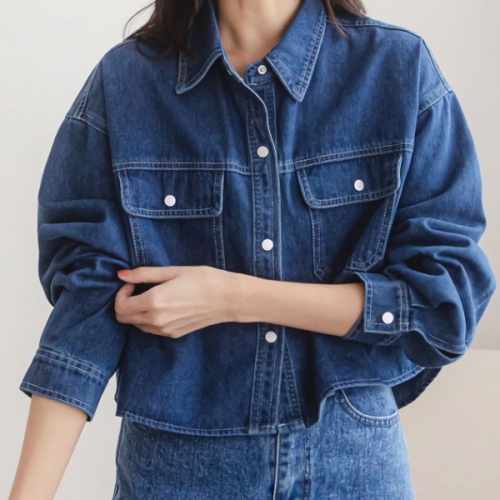 여성 모던 청 버튼 카라 크롭 데님 셔츠