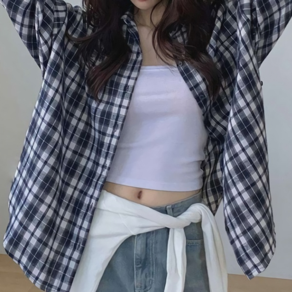 여성 텐셀 오버핏 옆단추 체크 셔츠