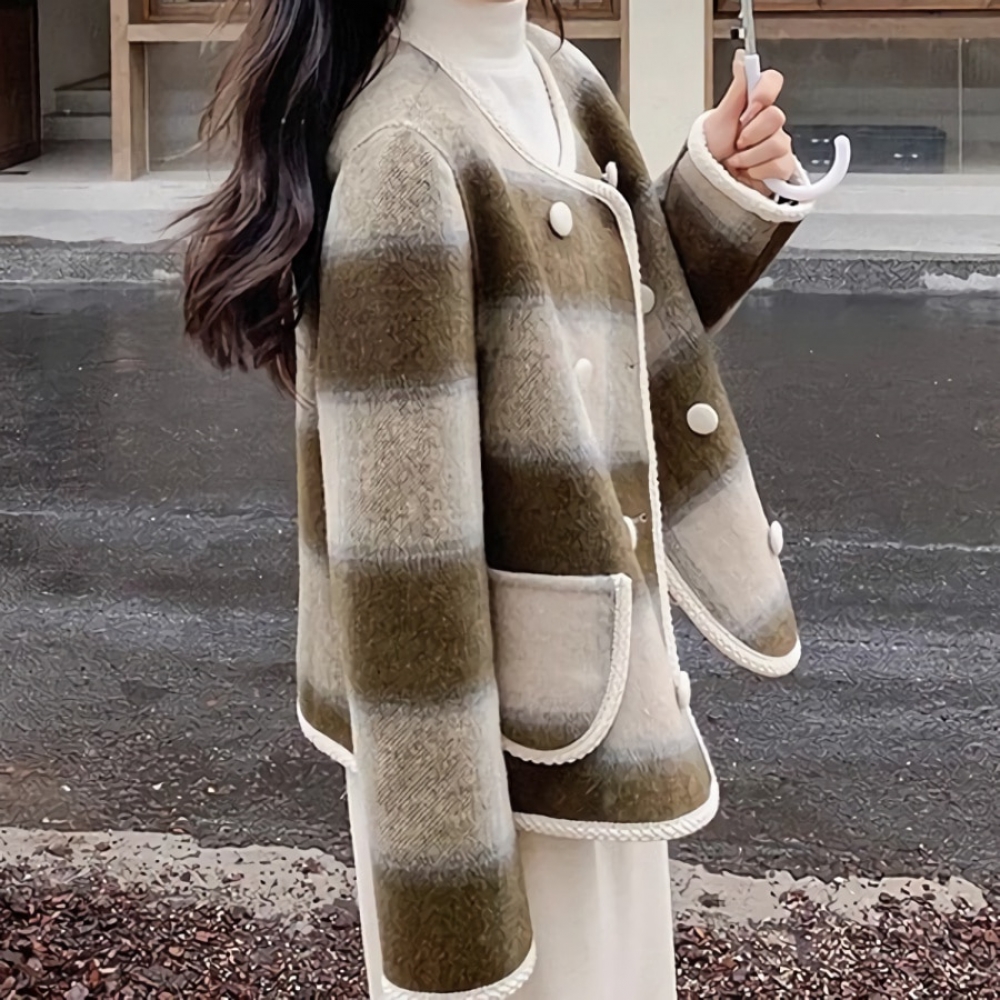 스타일리시한 체크 더블 버튼 숏 모직 코트