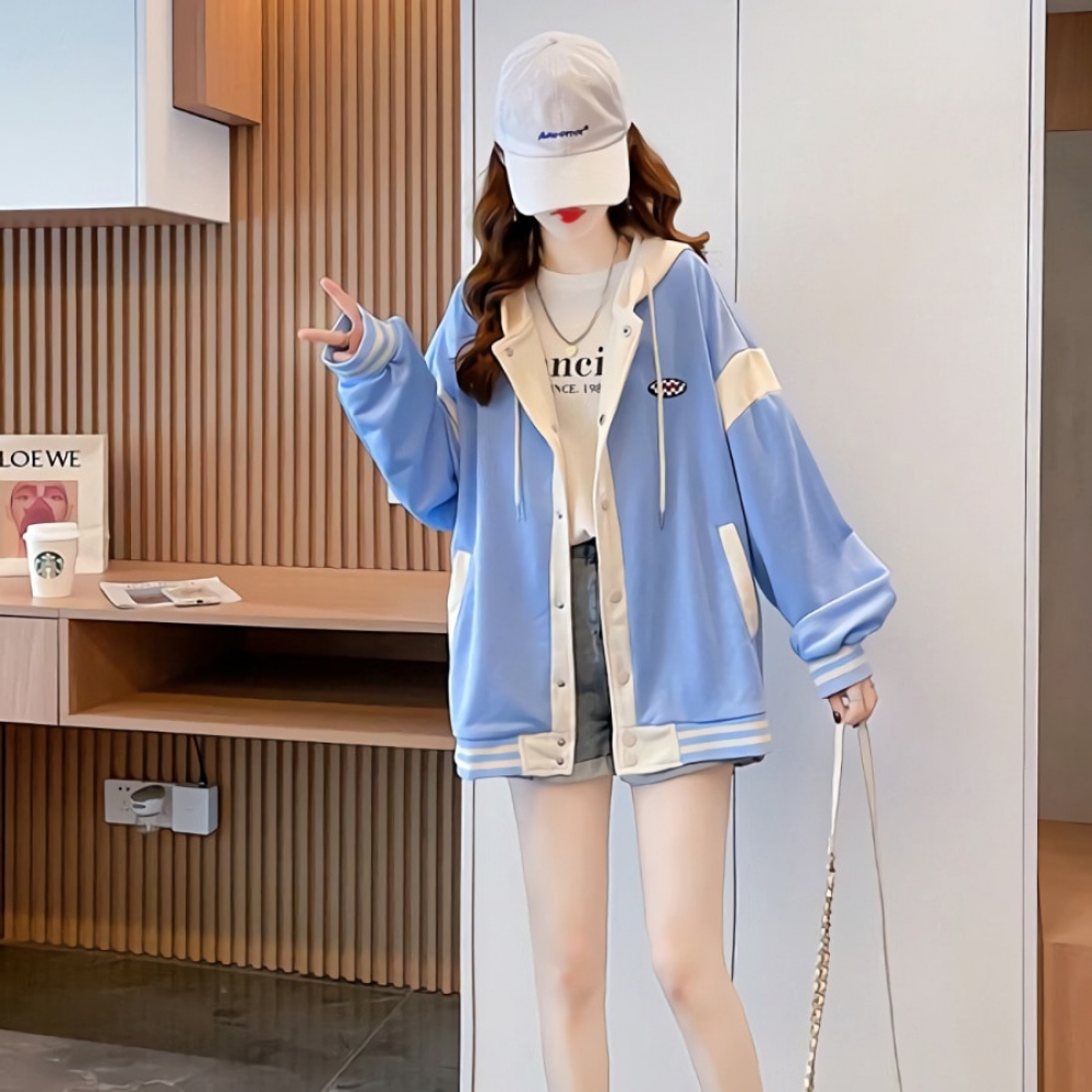 여성 캐주얼 루즈핏 후드 바시티 자켓