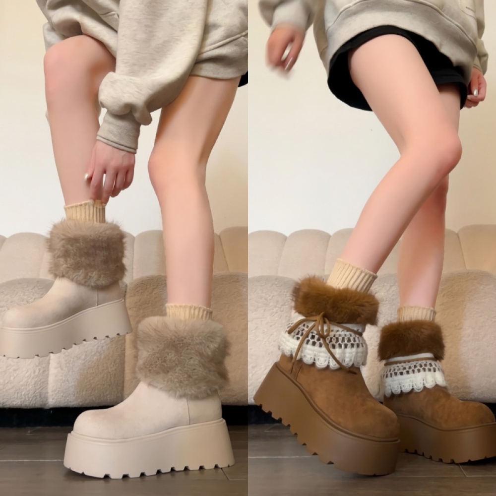 여성 겨울 2color 퍼 통굽 스웨이드 미들 부츠