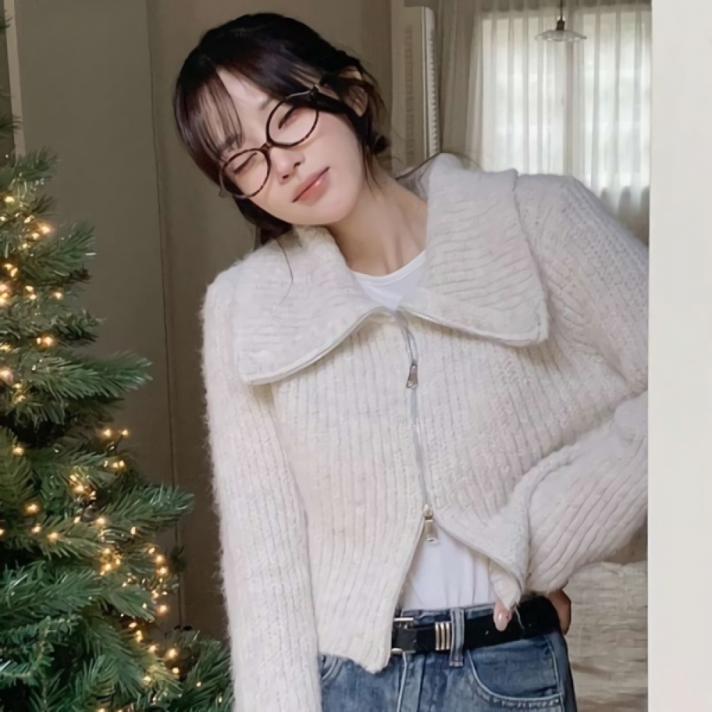 여성 세미크롭 하이넥 울 니트 집업 가디건