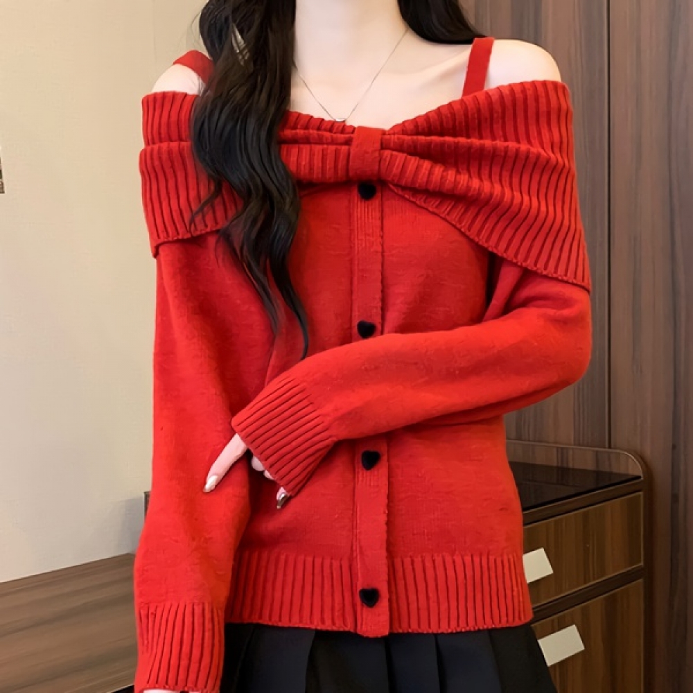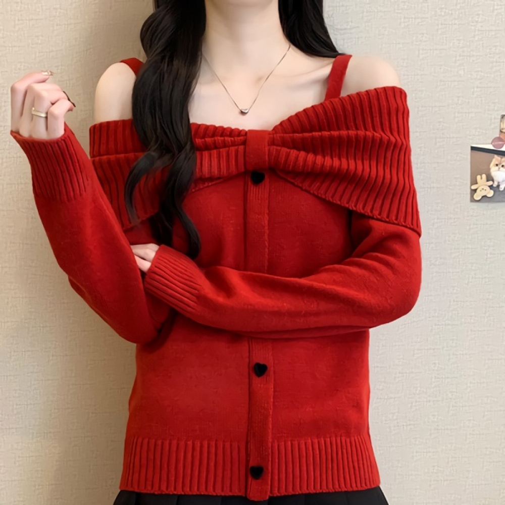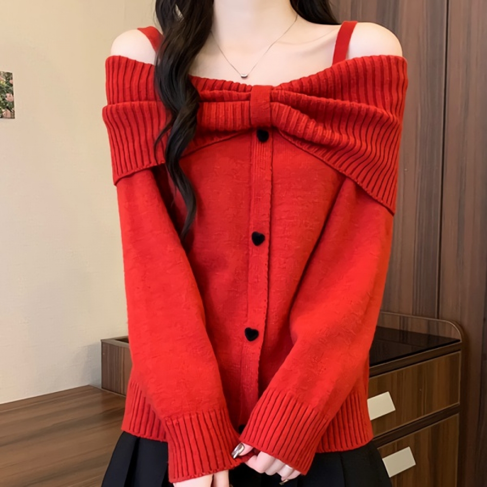 여성 겨울 데일리 오프숄더 리본 레드 니트