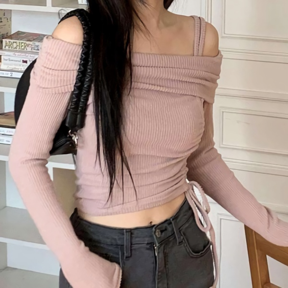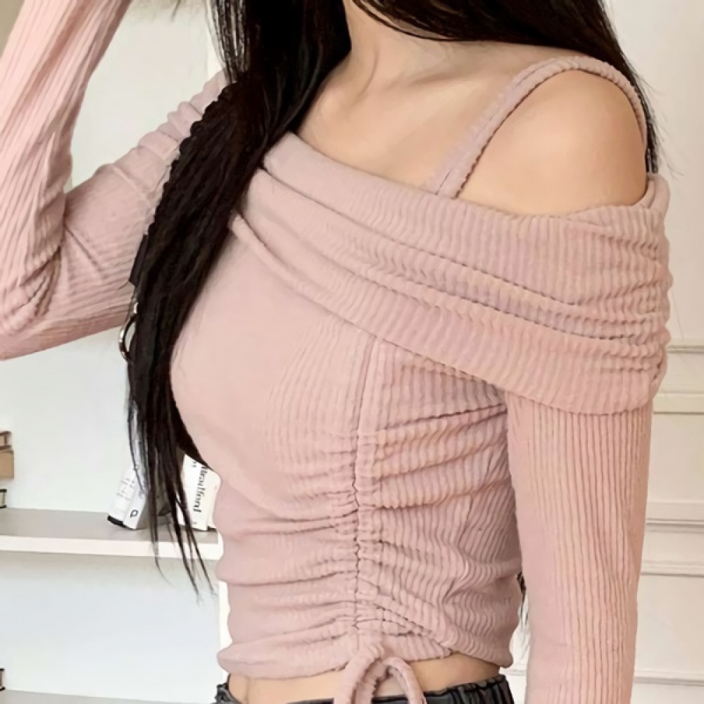 여성 겨울 스트링 끈 오프숄더 기모 니트