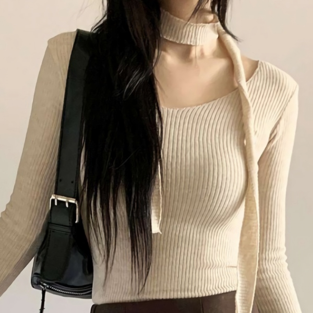 여성 브이넥 슬림 골지 울 니트 머플러 세트