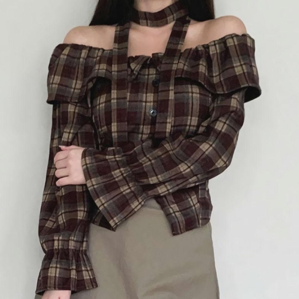 여성 초커 스트랩 오프숄더 체크 블라우스