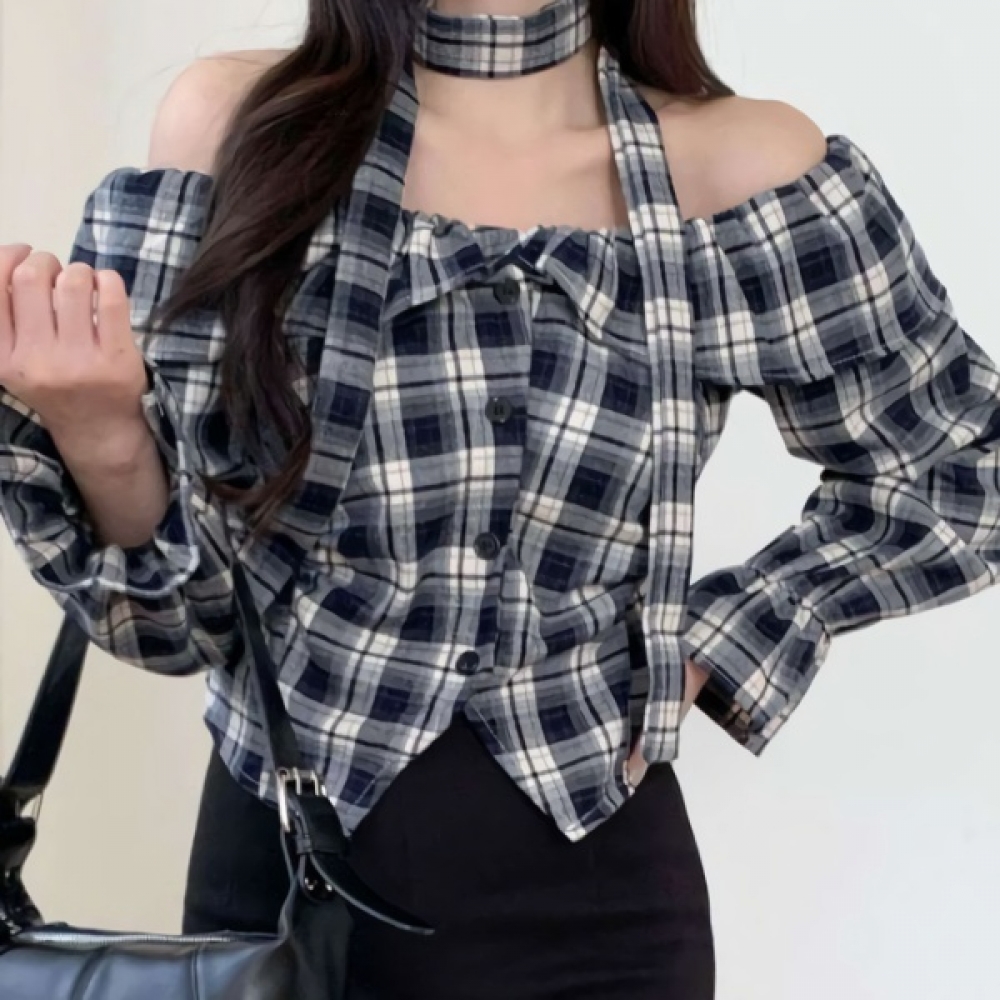 여성 초커 스트랩 오프숄더 체크 블라우스