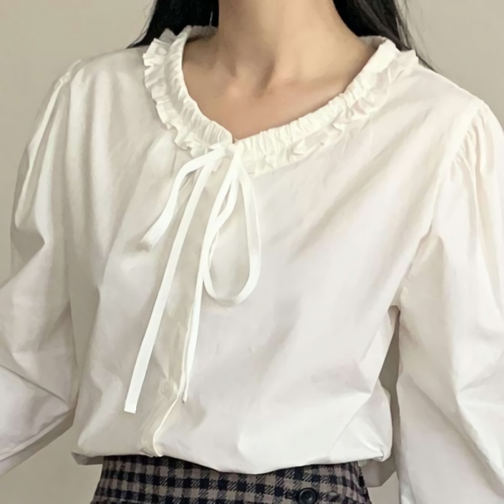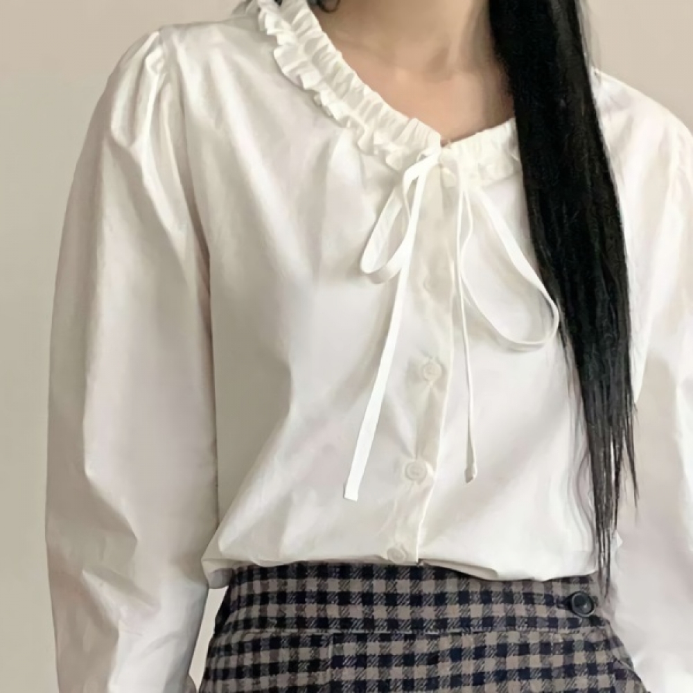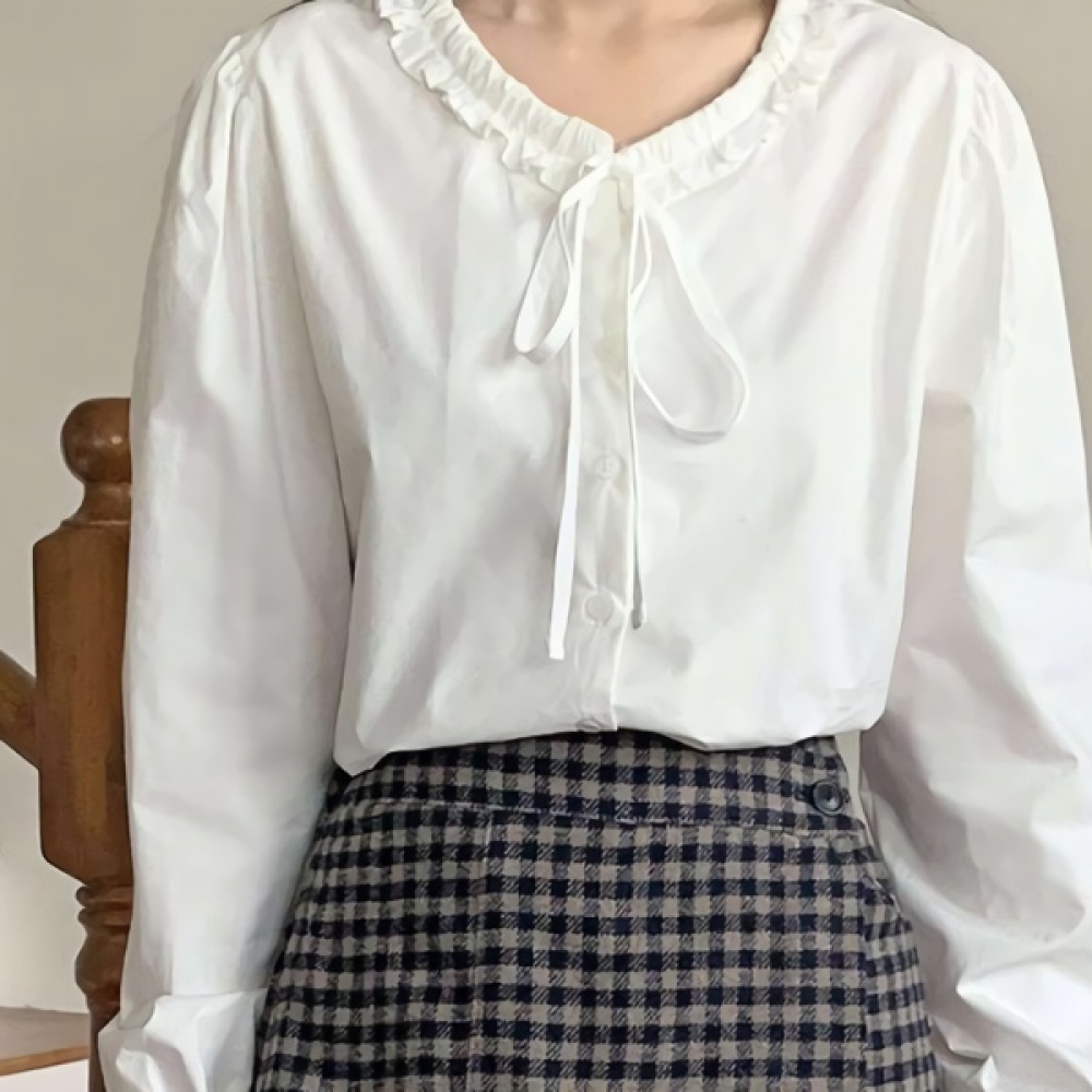 여성 겨울 체크 프릴 크롭 초커 블라우스