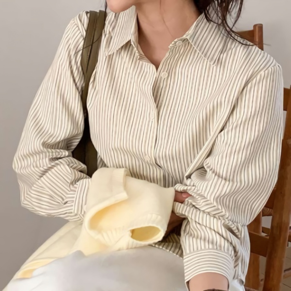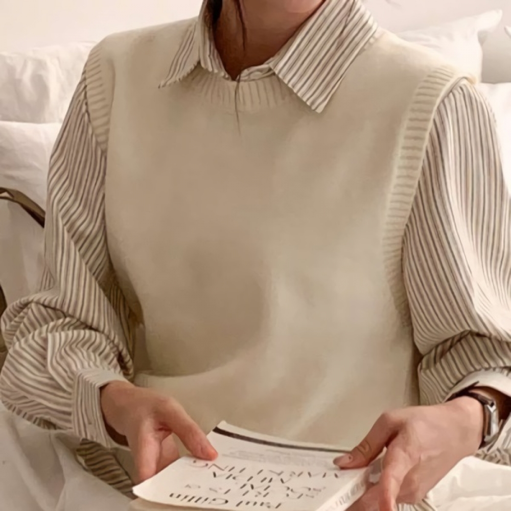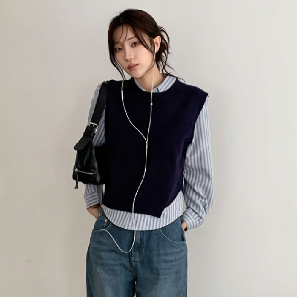 여성 레이어드 니트 조끼 줄지 셔츠 세트