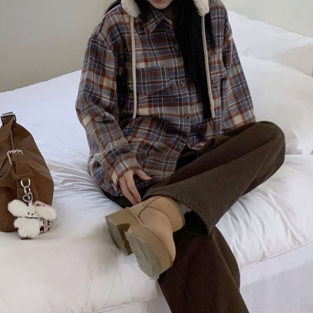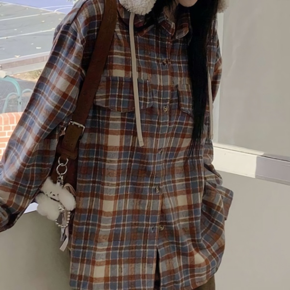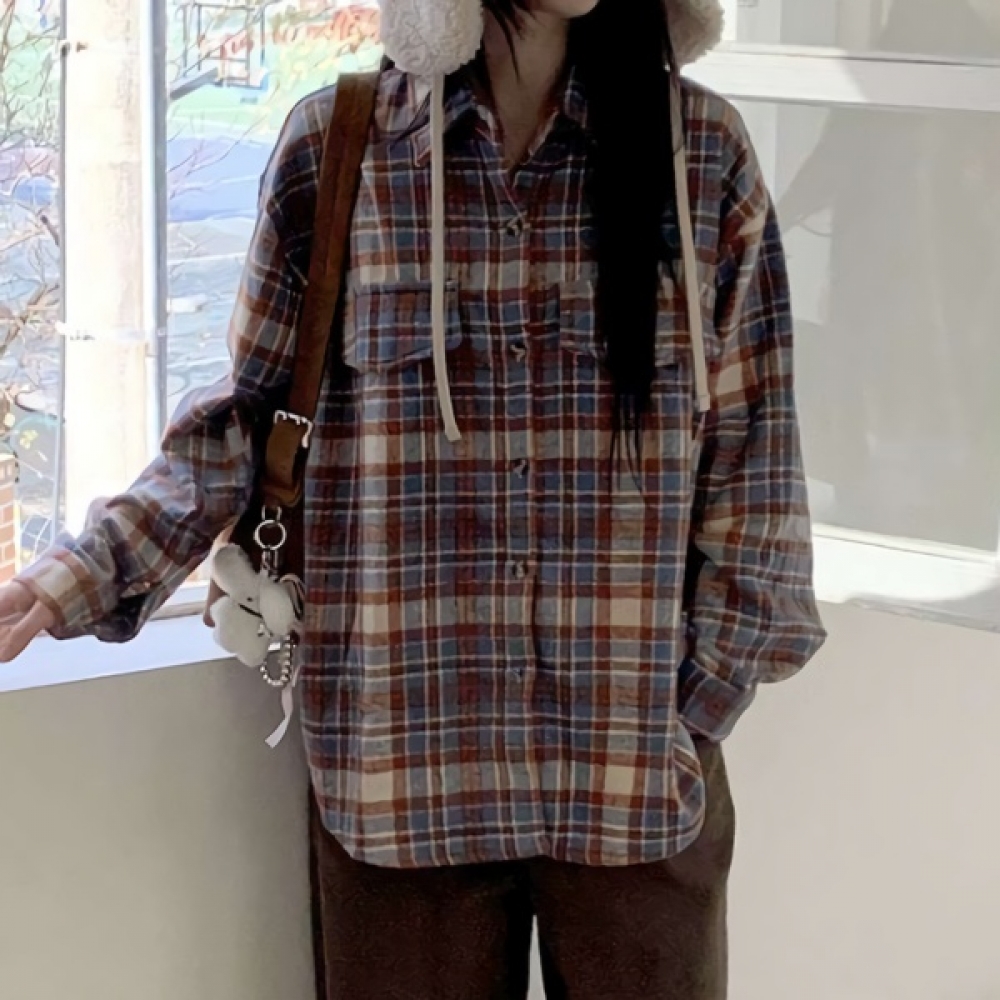 여성 피치기모 루즈핏 체크 포켓 셔츠