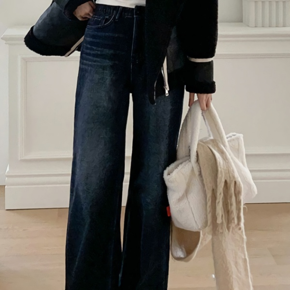 여성 논페이드 커브드 와이드 기모 데님 팬츠