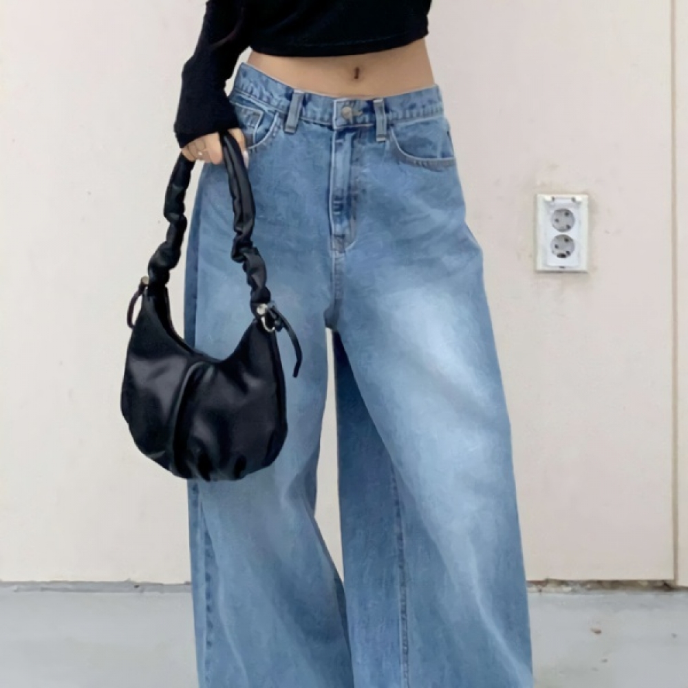 여성 밑단 스냅 벌룬핏 와이드 워싱 데님 팬츠