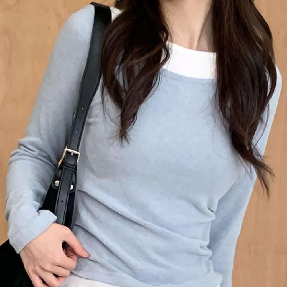 여성 보트넥 앙고라 배색 레이어드 티셔츠
