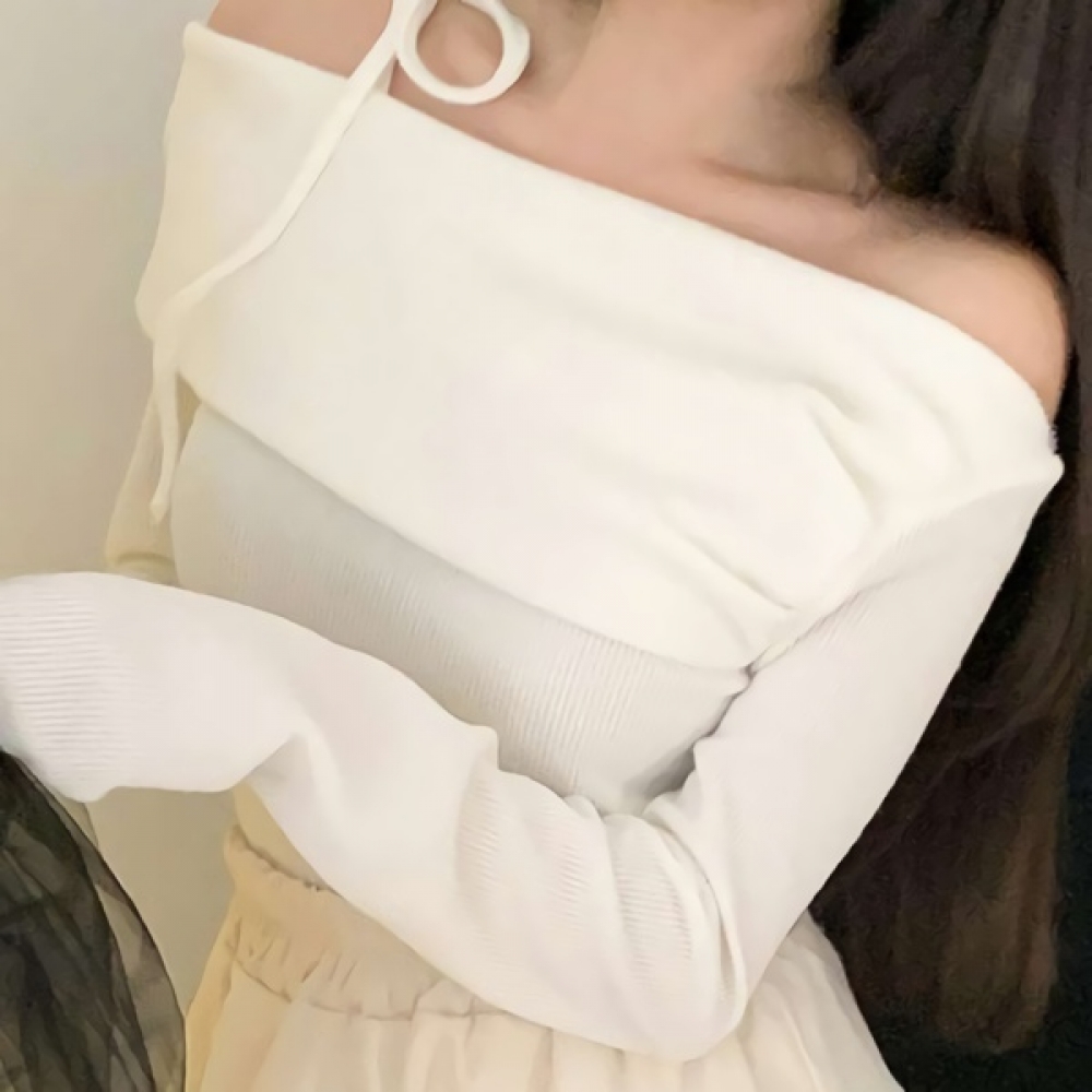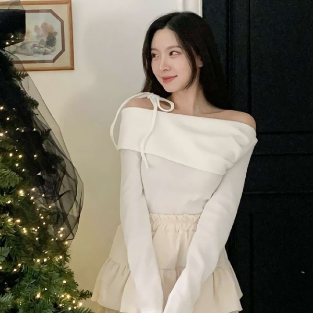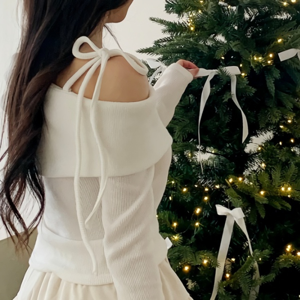 여성 겨울 오프숄더 리본 니트 티셔츠
