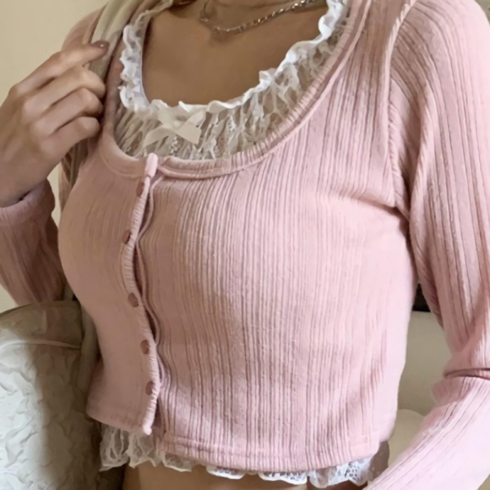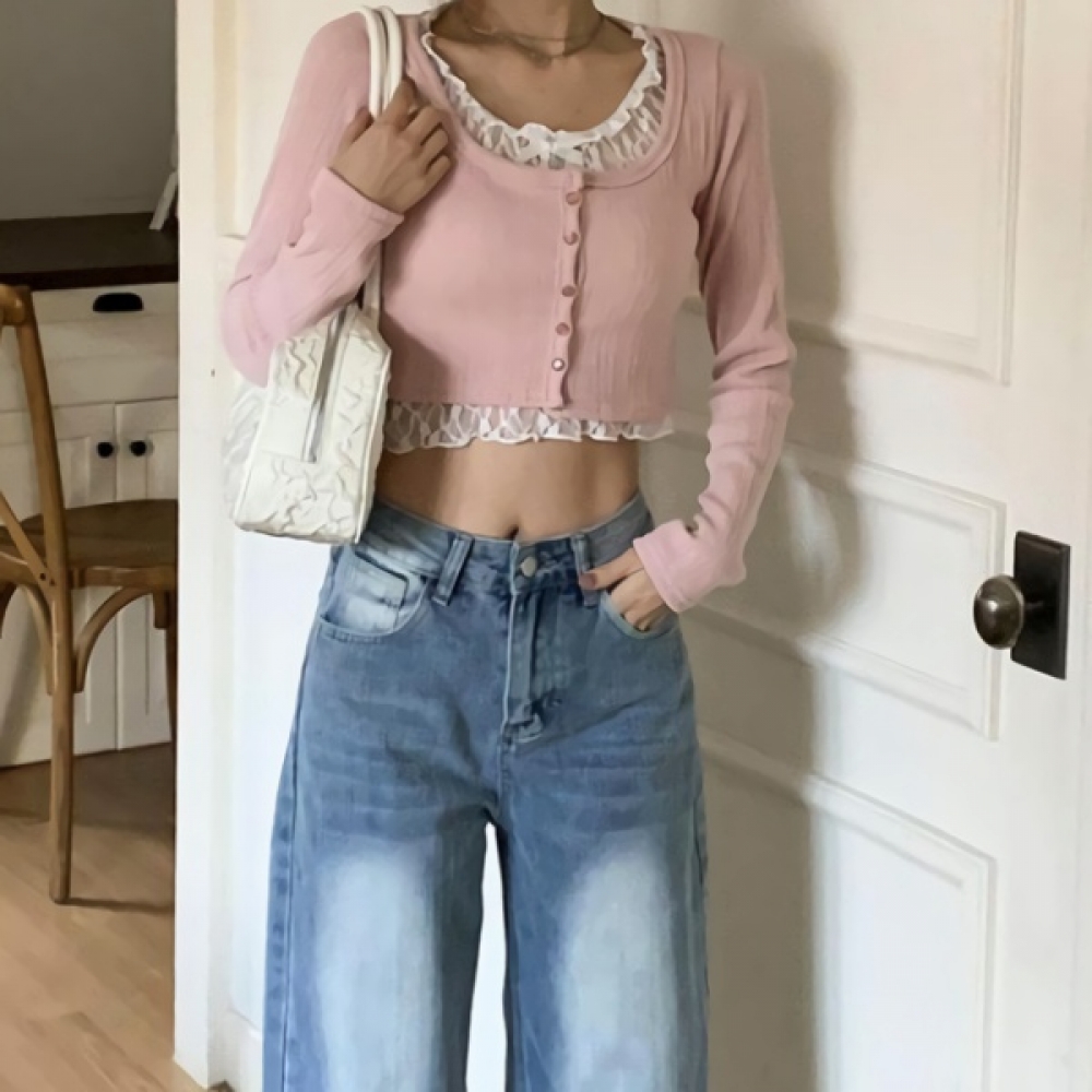 여성 리본 프릴 레이스 레이어드 크롭 가디건