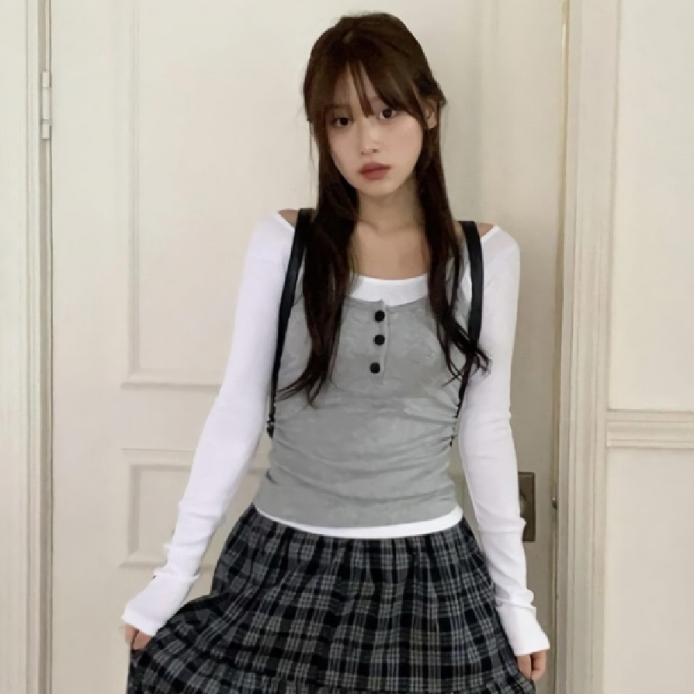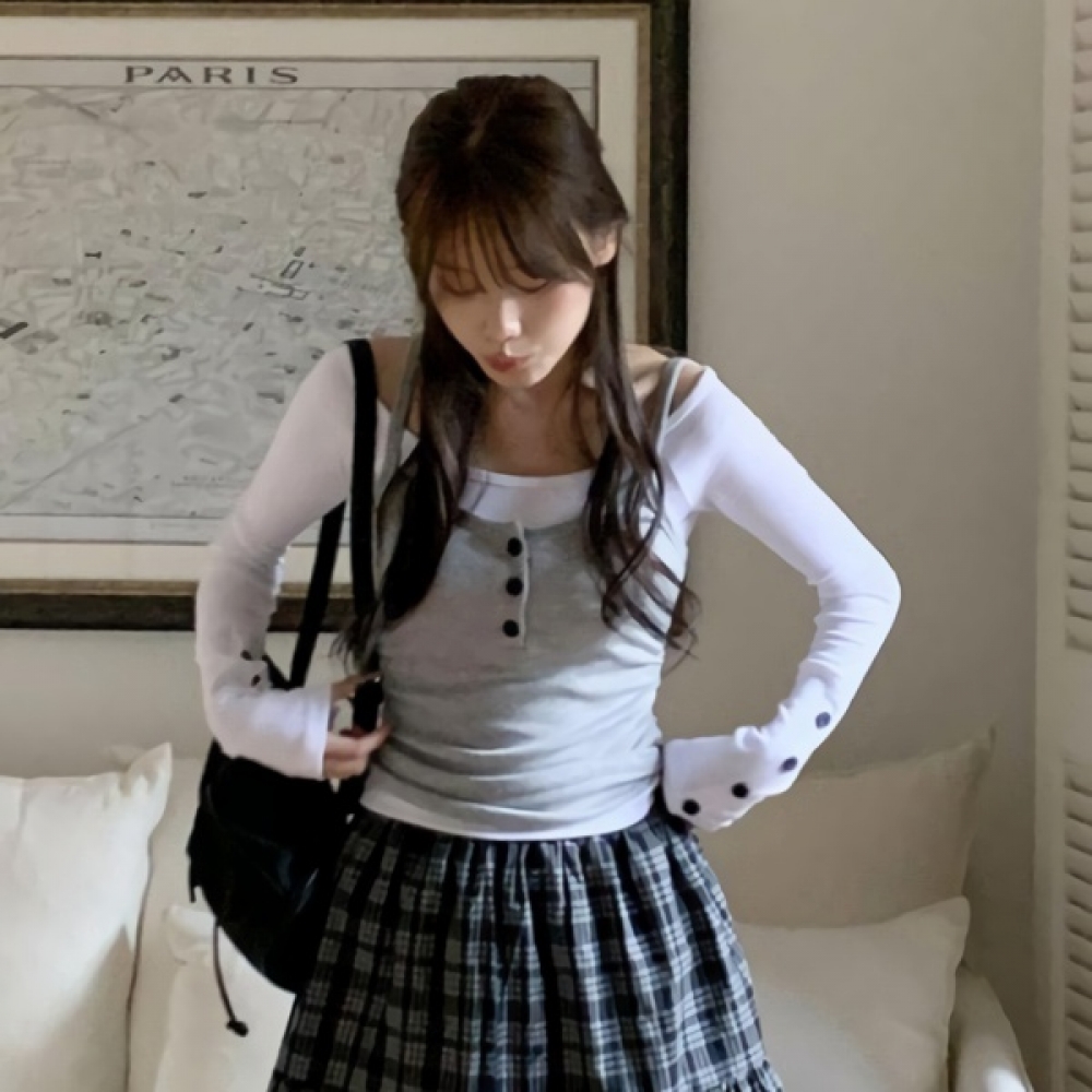 배색 소매 버튼 레이어드 뷔스티에 티셔츠 세트
