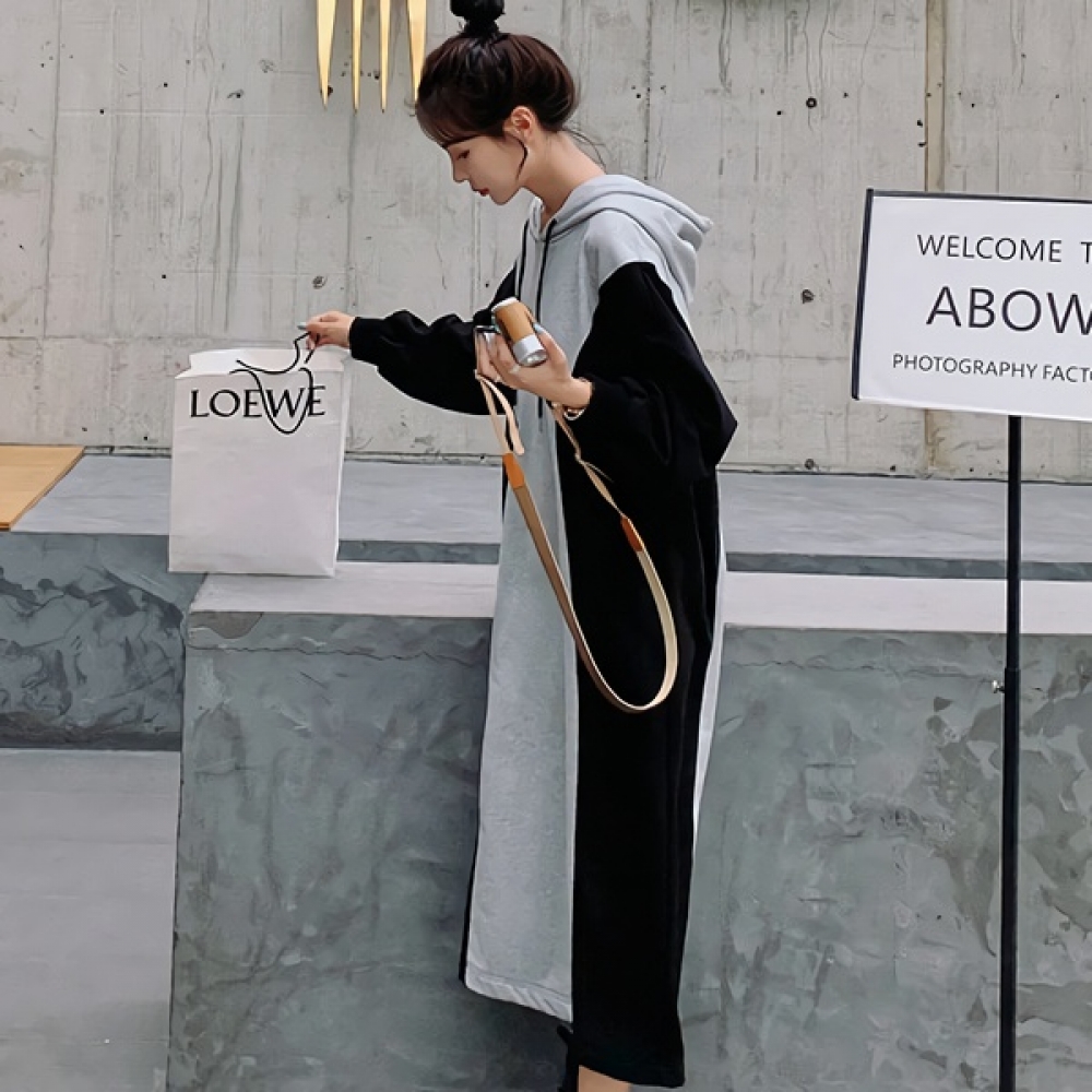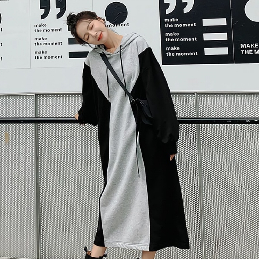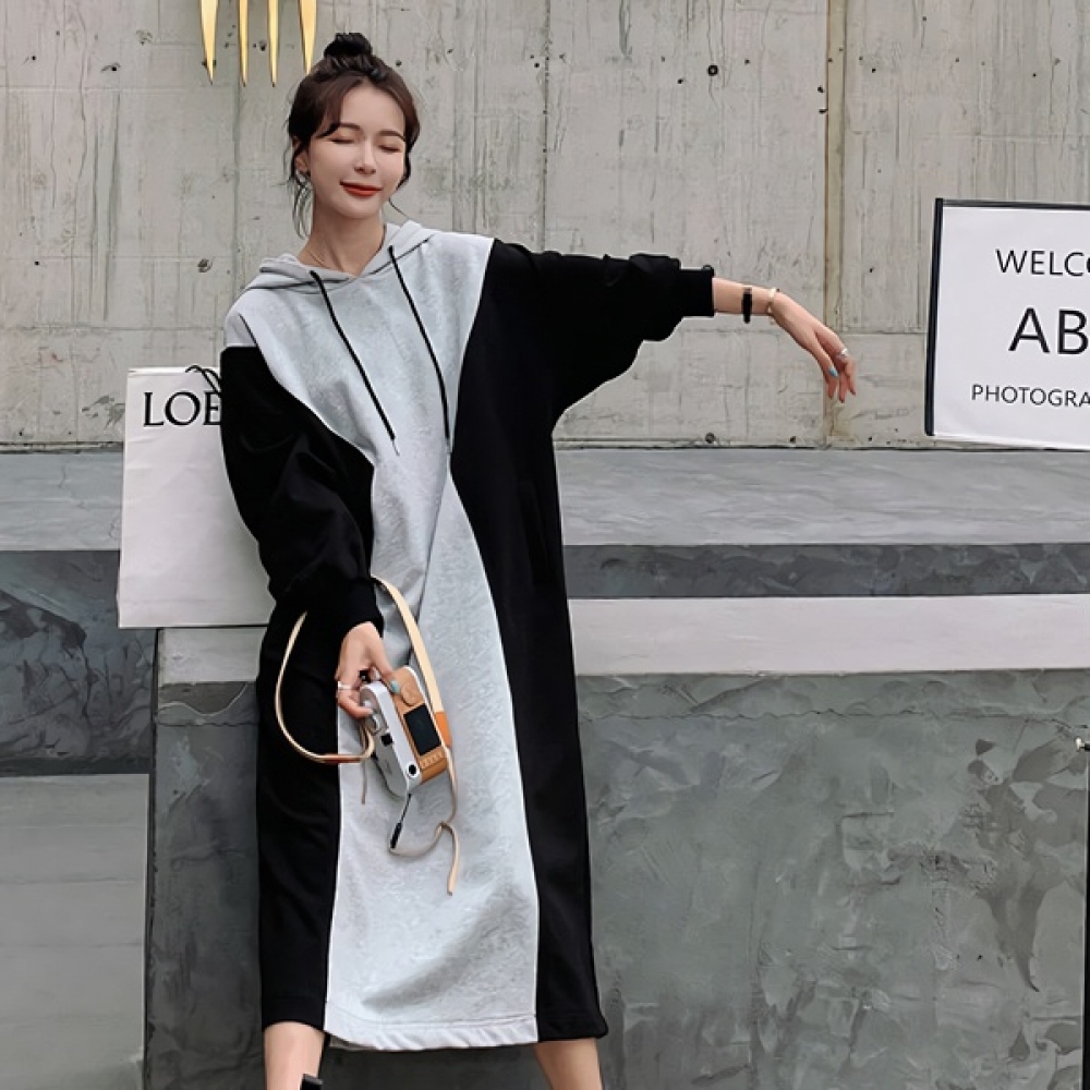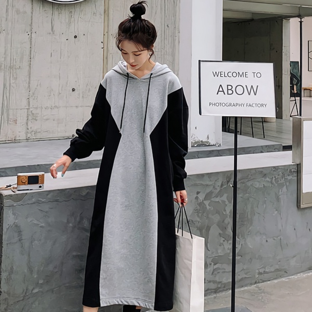 여성 봄 배색 후드 롱 원피스 캐주얼 데일리룩