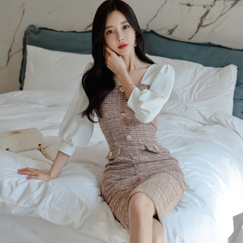 여성 봄 트위드 버튼 스퀘어넥 원피스
