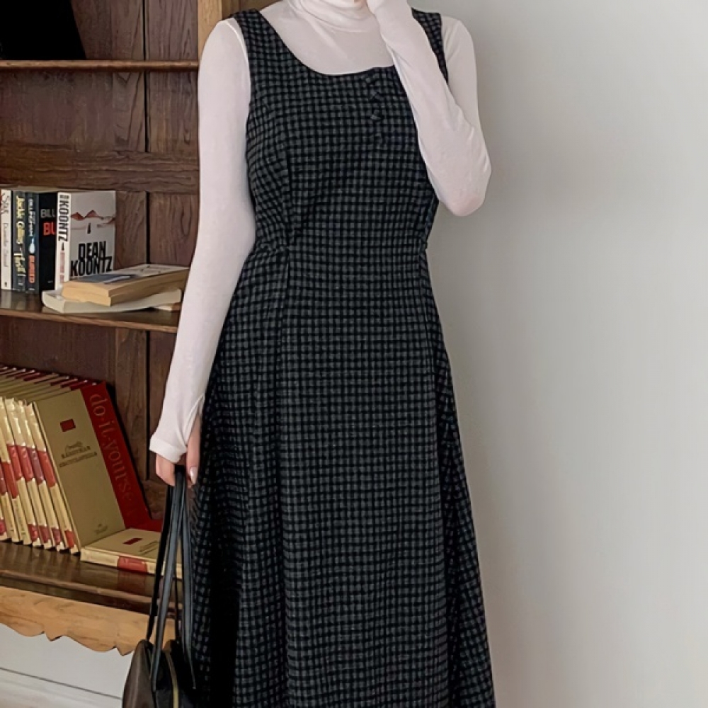 여성 빈티지 모리걸 민소매 체크 롱 원피스