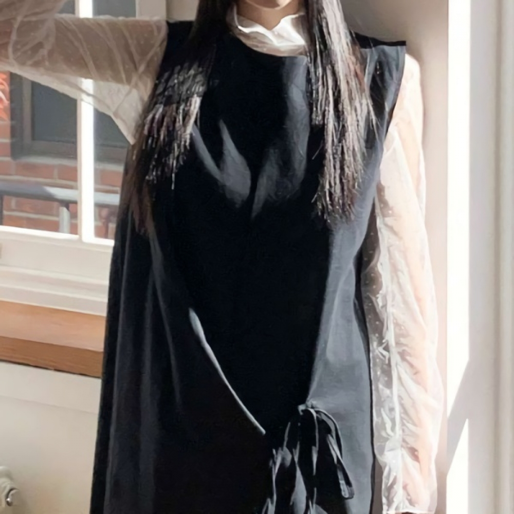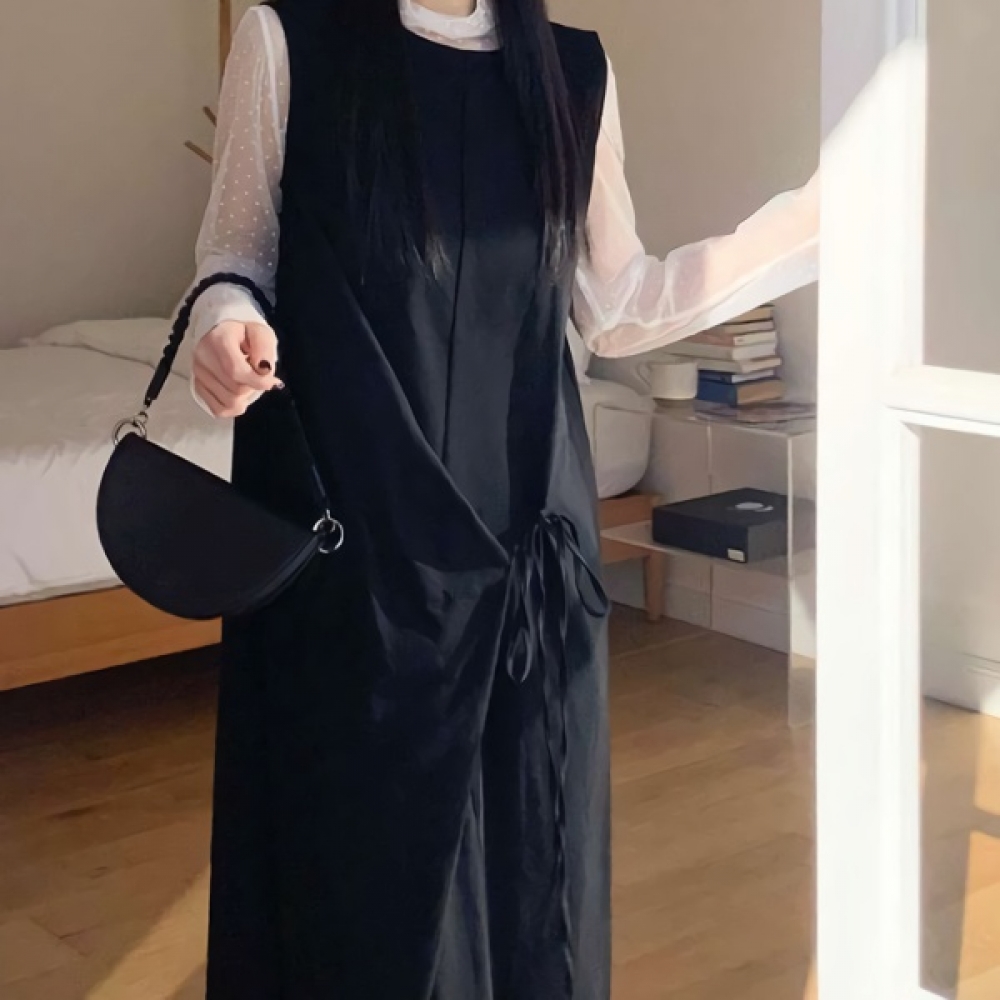 여성 묶음 포인트 라운드 민소매 롱 원피스