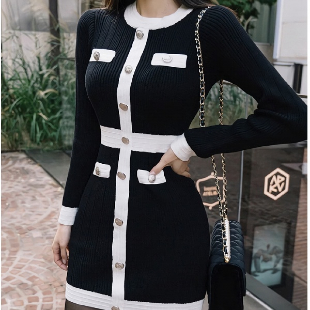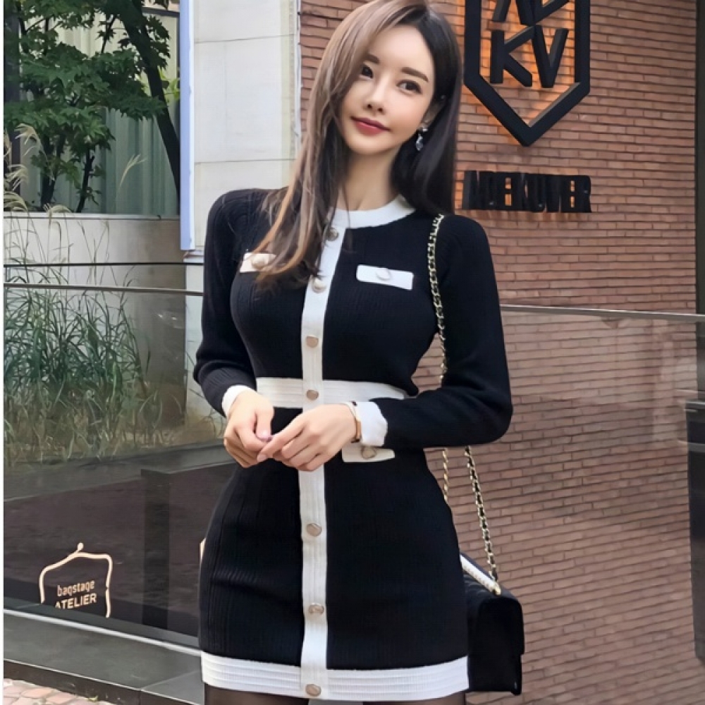 여성 봄 데일리 라인 버튼 배색 원피스