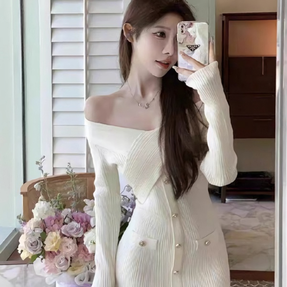 여성 오프숄더 크로스 니트 미니 원피스