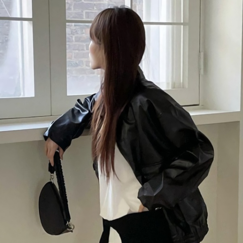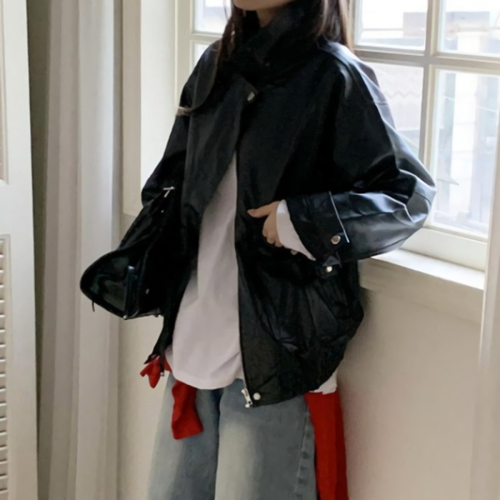 여성 오버핏 카라 하프 레더 가죽 자켓