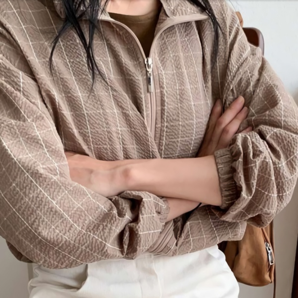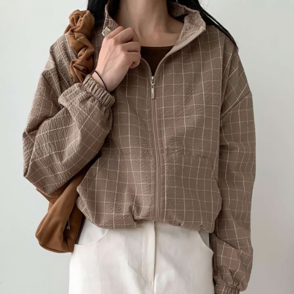 여성 하이넥 체크 스트링 크롭 집업