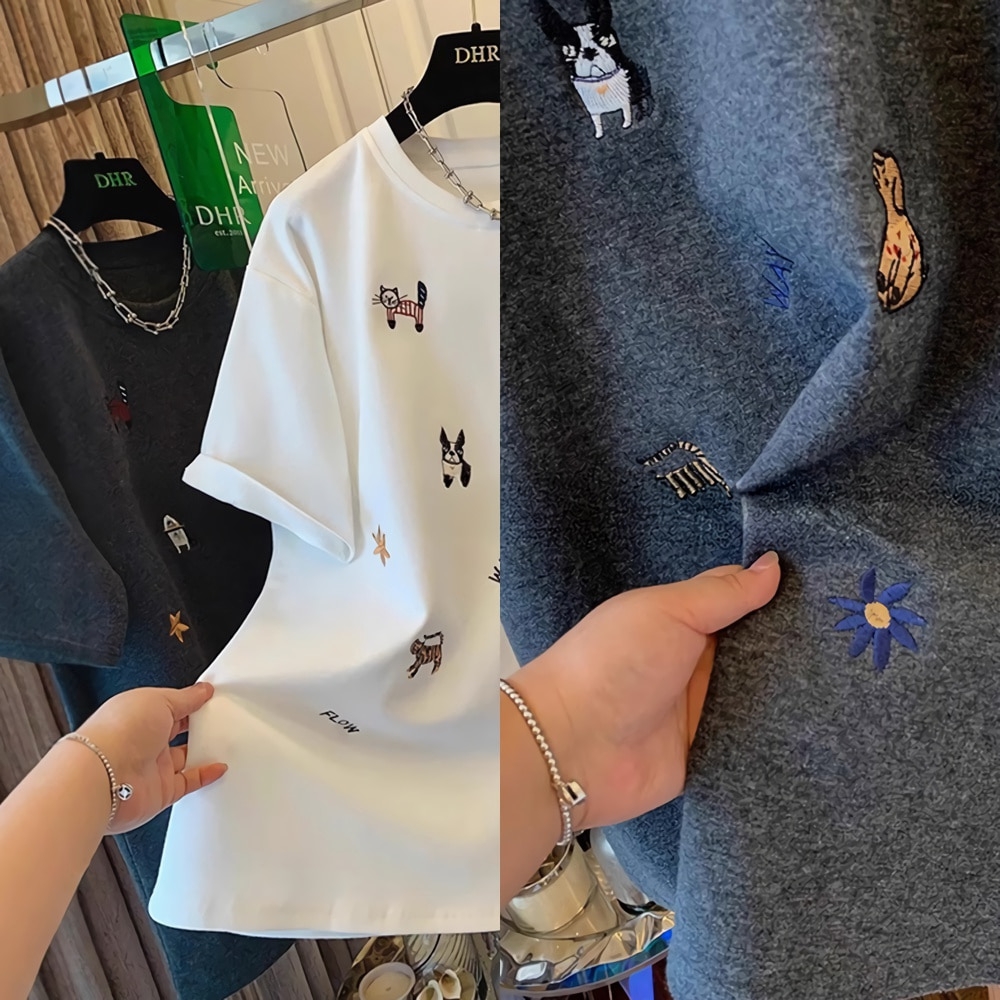여성 미니 캐릭터 자수 포인트 반팔 핏 티셔츠