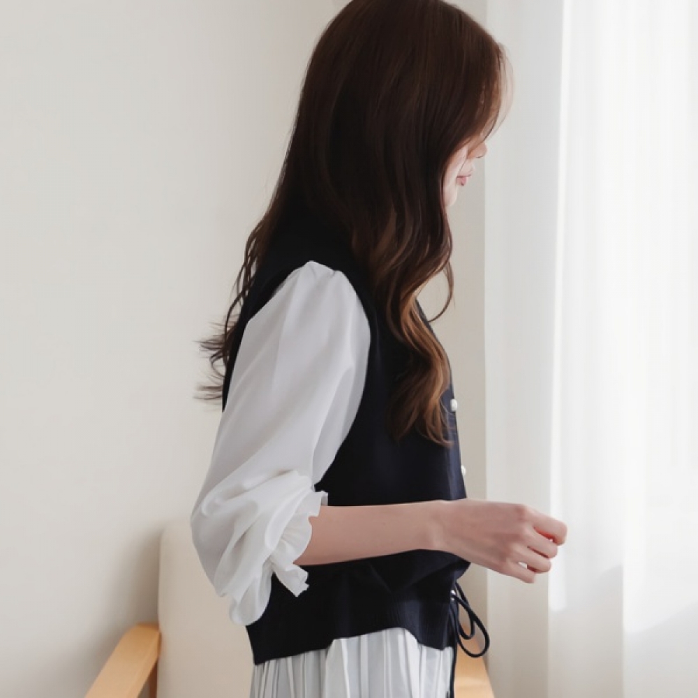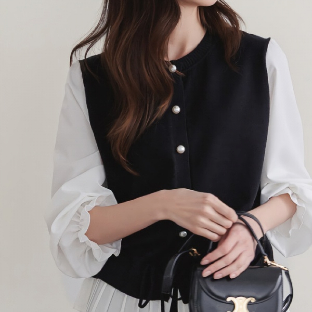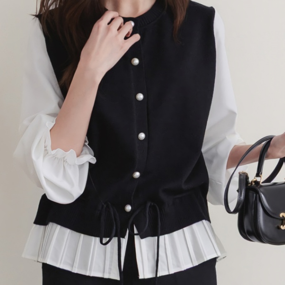여성 셔츠 배색 밑단 플리츠 니트 가디건
