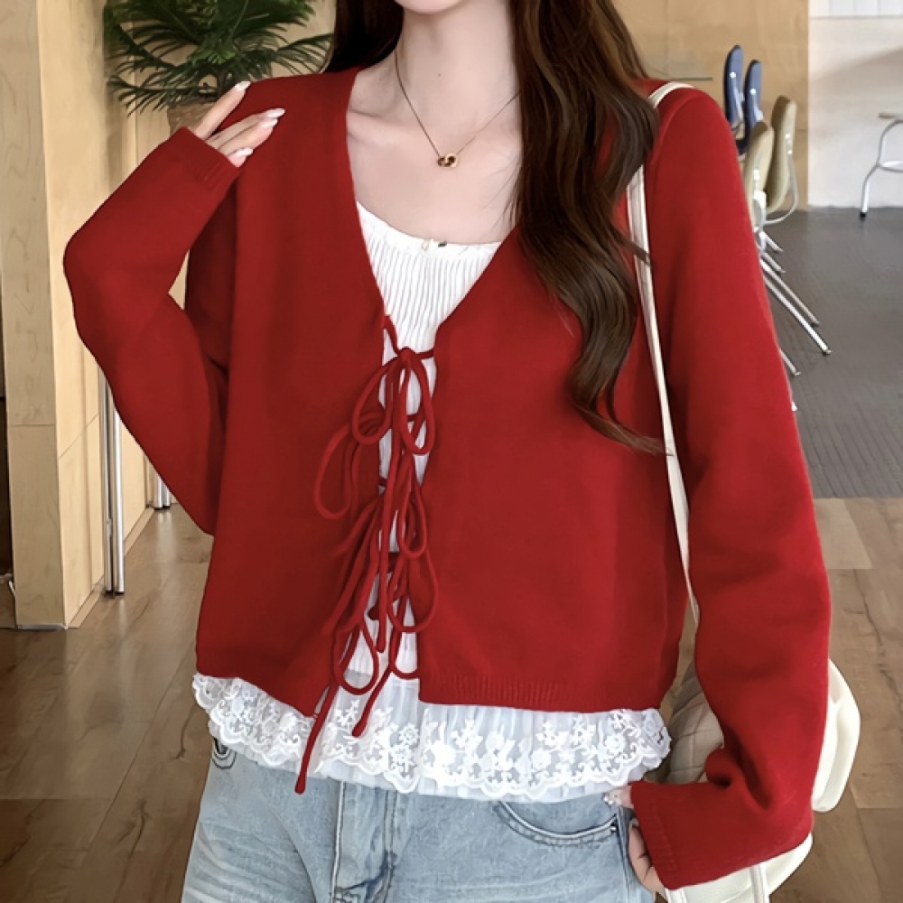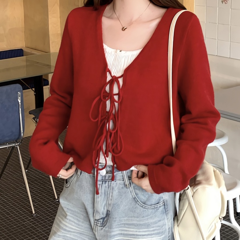 여성 봄 데일리 레드 스트링 크롭 가디건