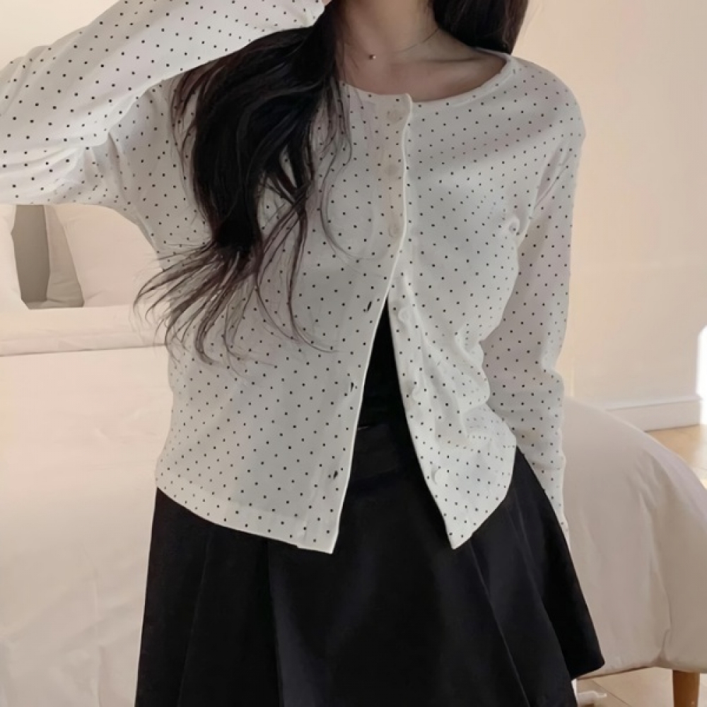 여성 슬림핏 도트 라운드 세미크롭 가디건