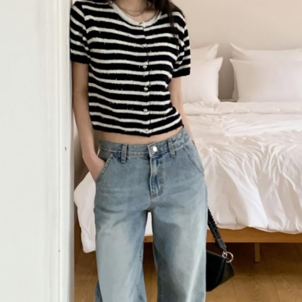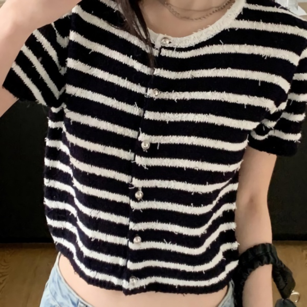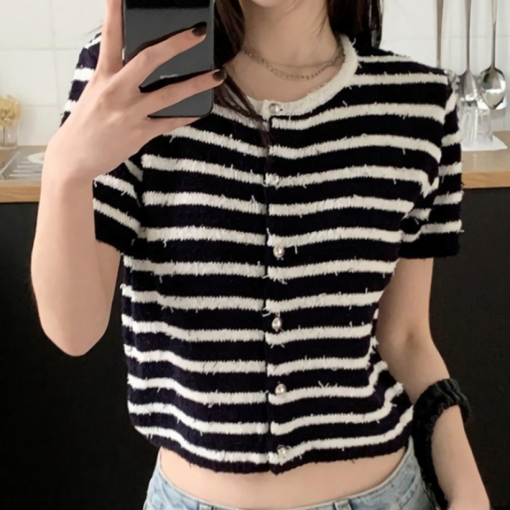 여성 부클 스트라이프 반팔 니트 가디건