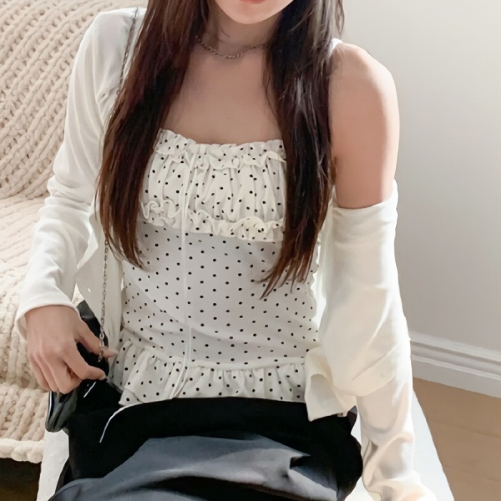 여성 봄 프릴 도트 끈나시 가디건 세트