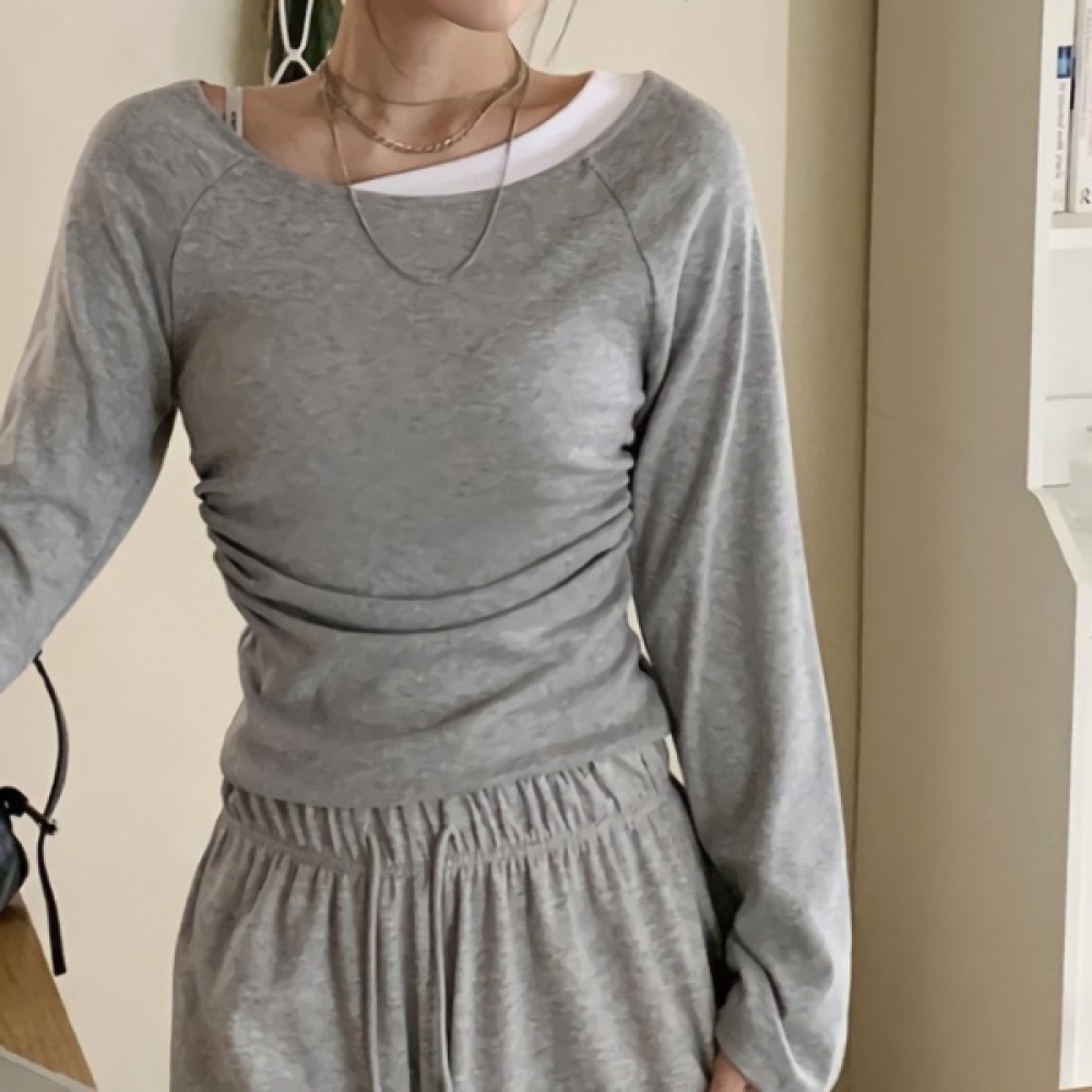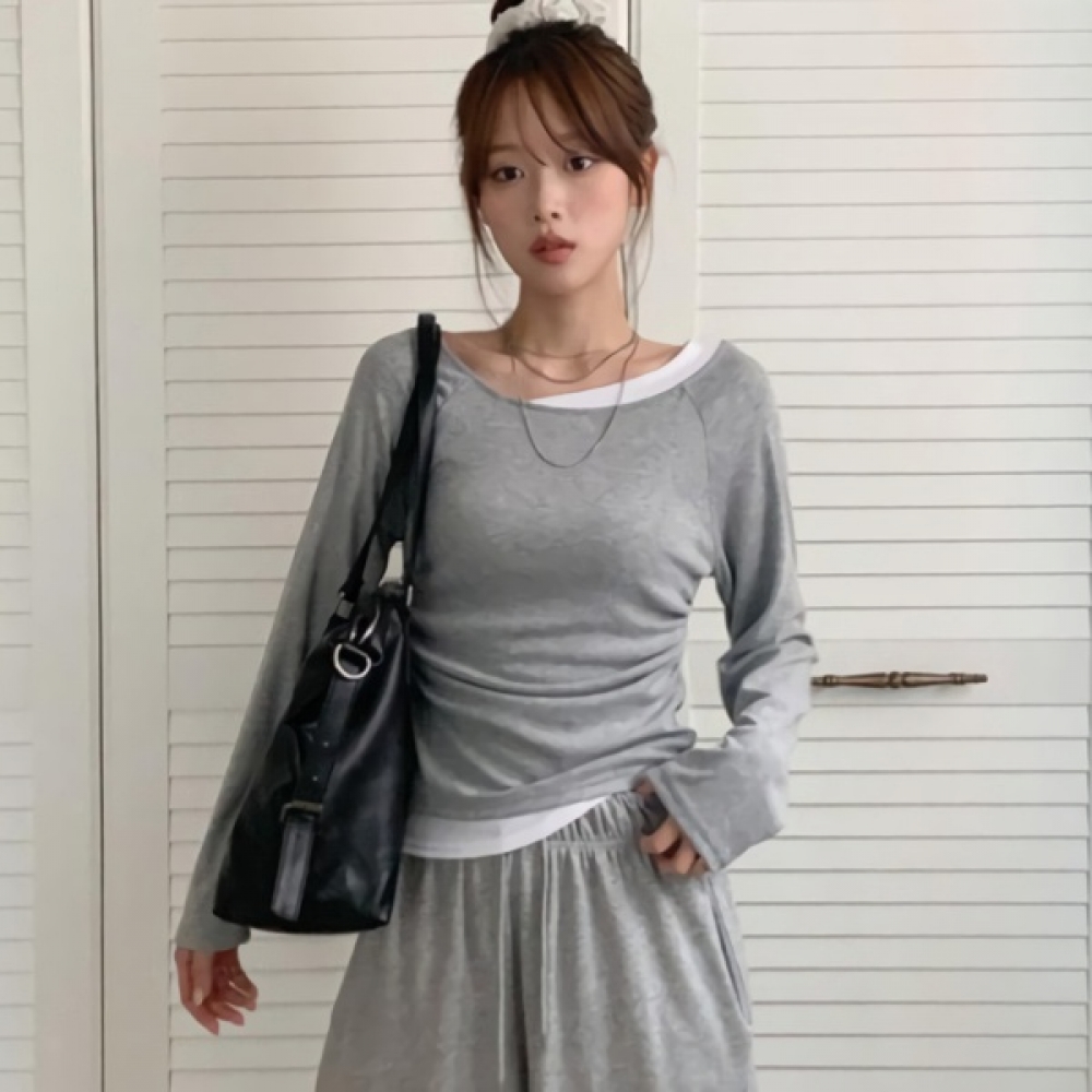 여성 언발 배색 레이어드 옆셔링 슬림 티셔츠