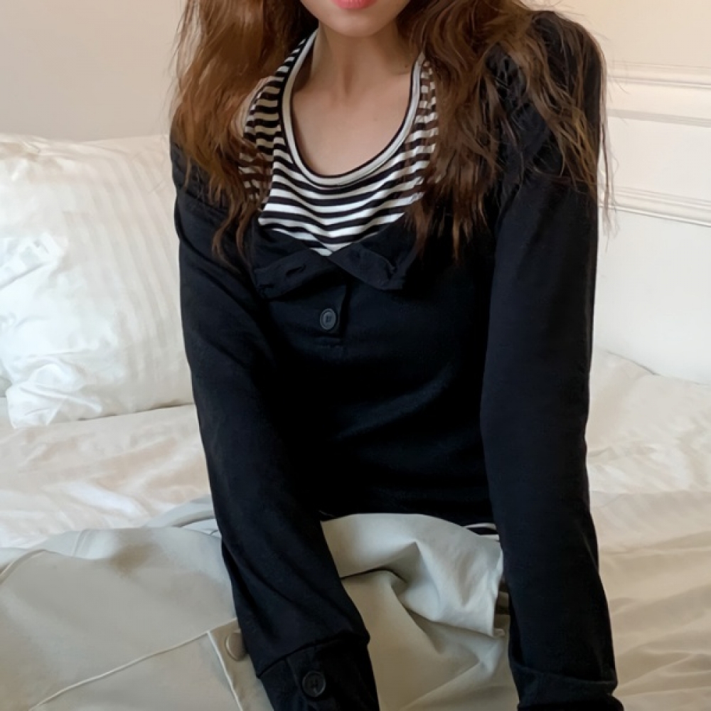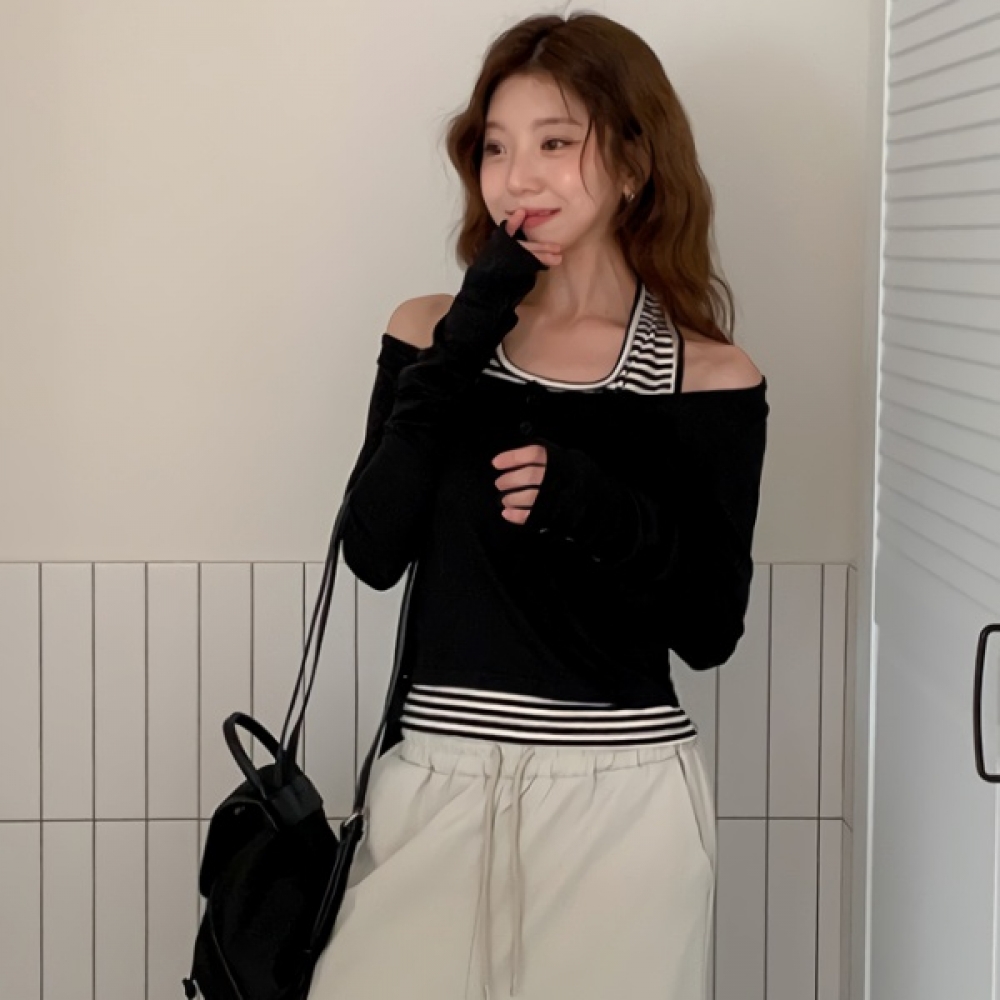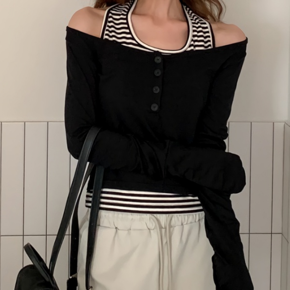 여성 단가라 홀터넥 레이어드 소매 버튼 티셔츠