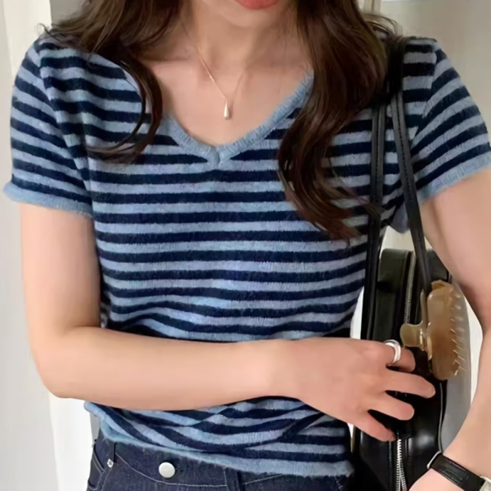 여성 봄 여름 데일리 브이넥 반팔 니트