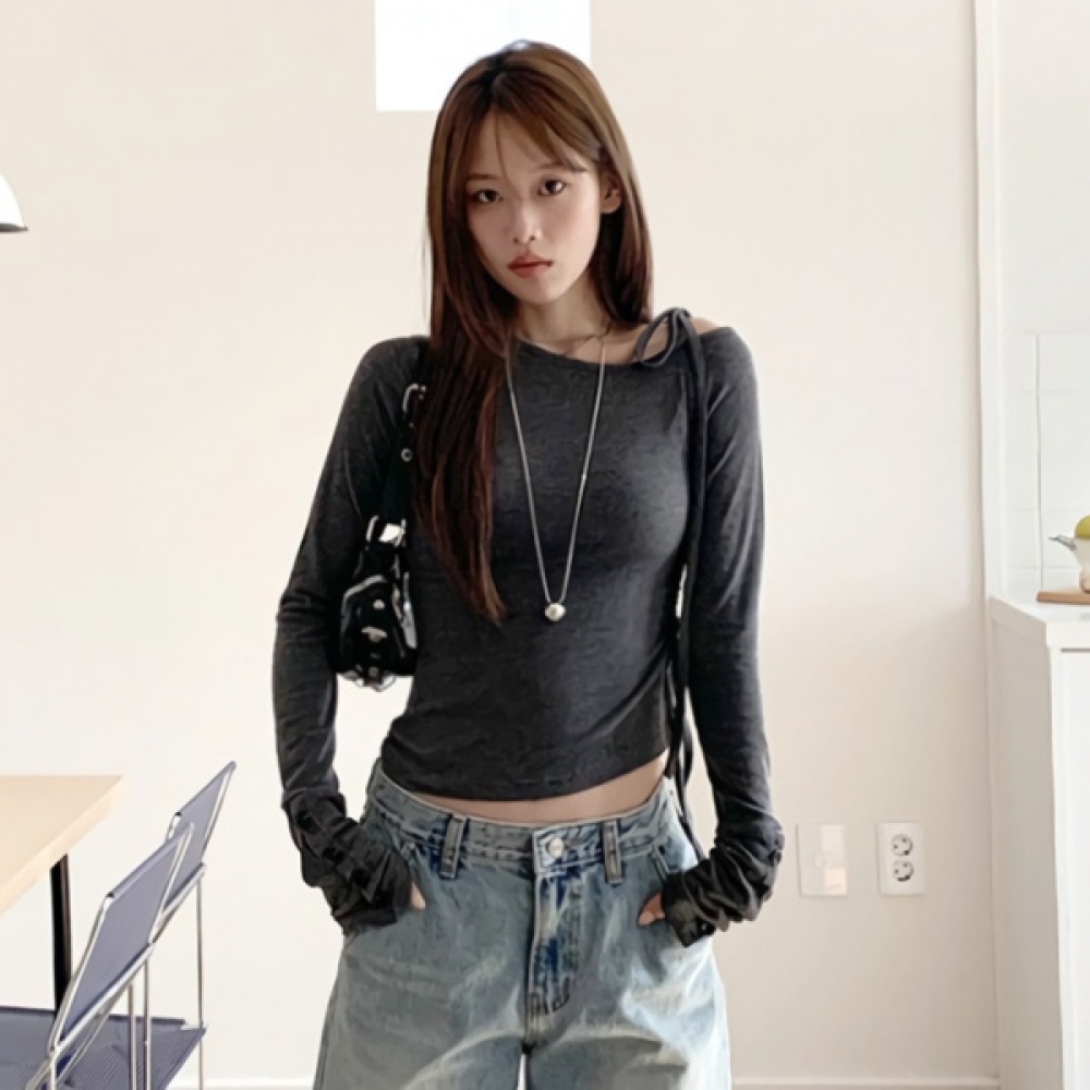 여성 소매 버튼 셔링 원 오프숄더 슬림 니트