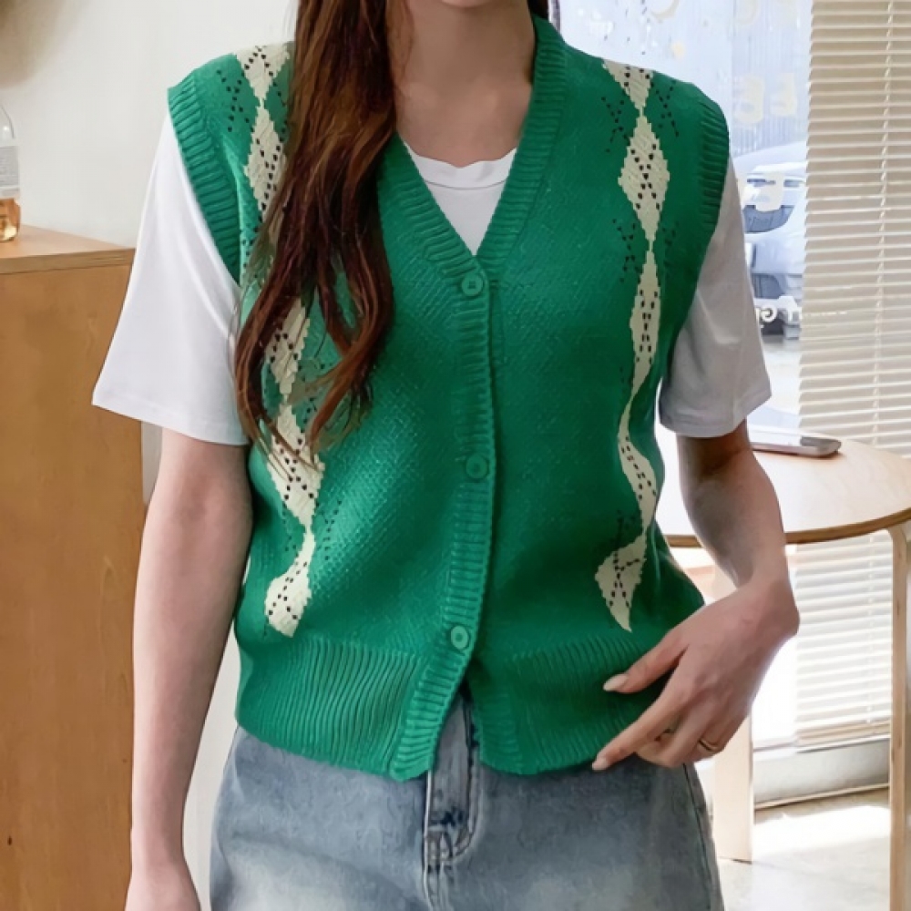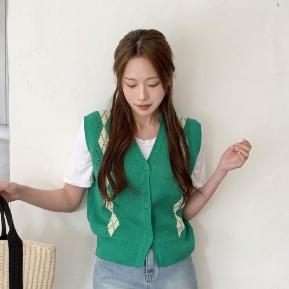 여성 봄 브이넥 아가일 니트 베스트