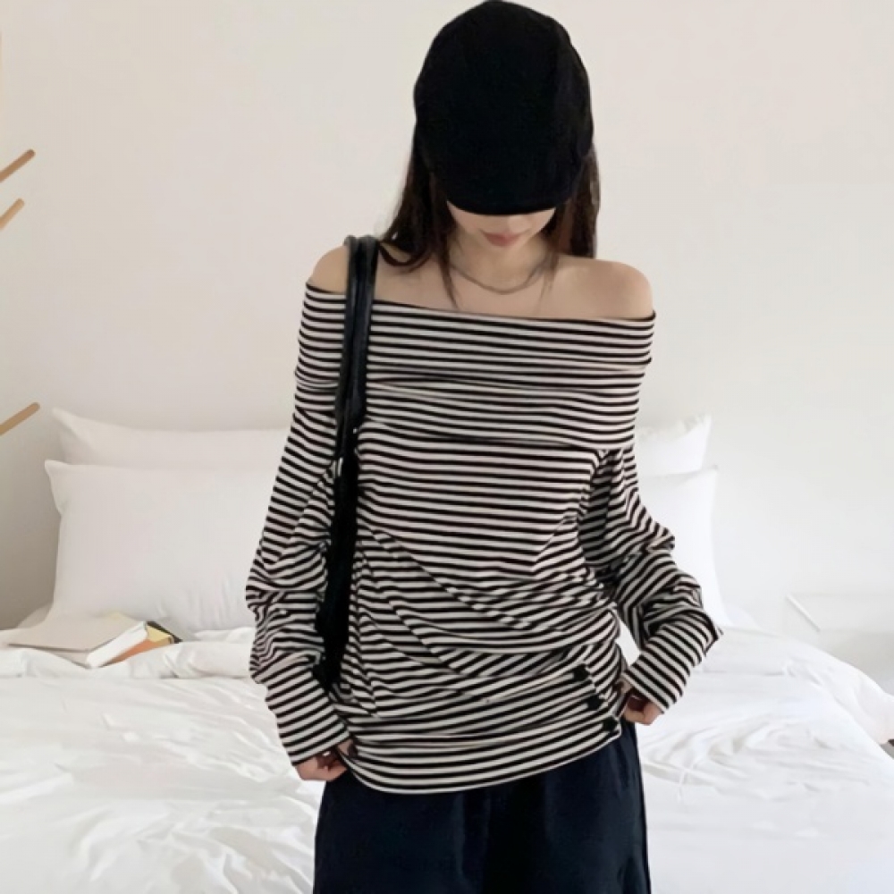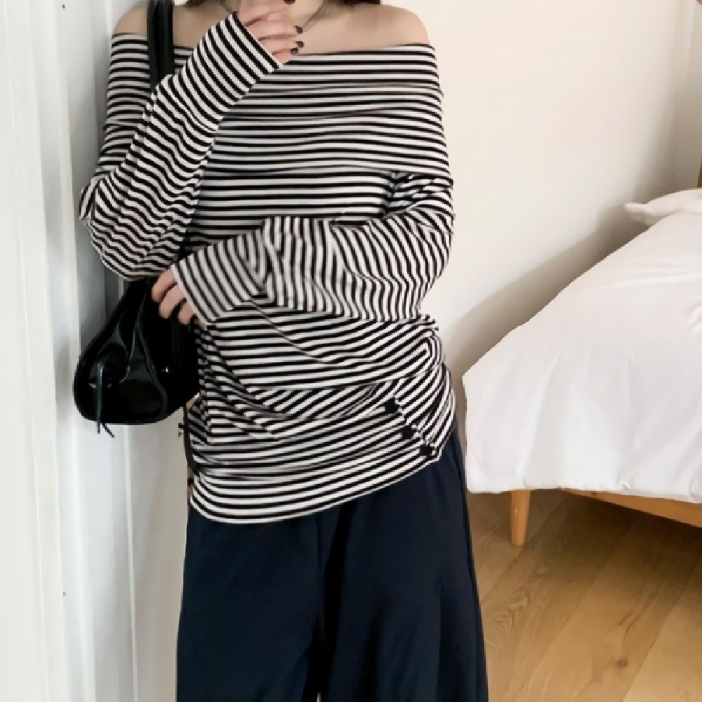 여성 스트라이프 루즈핏 오프숄더 맨투맨